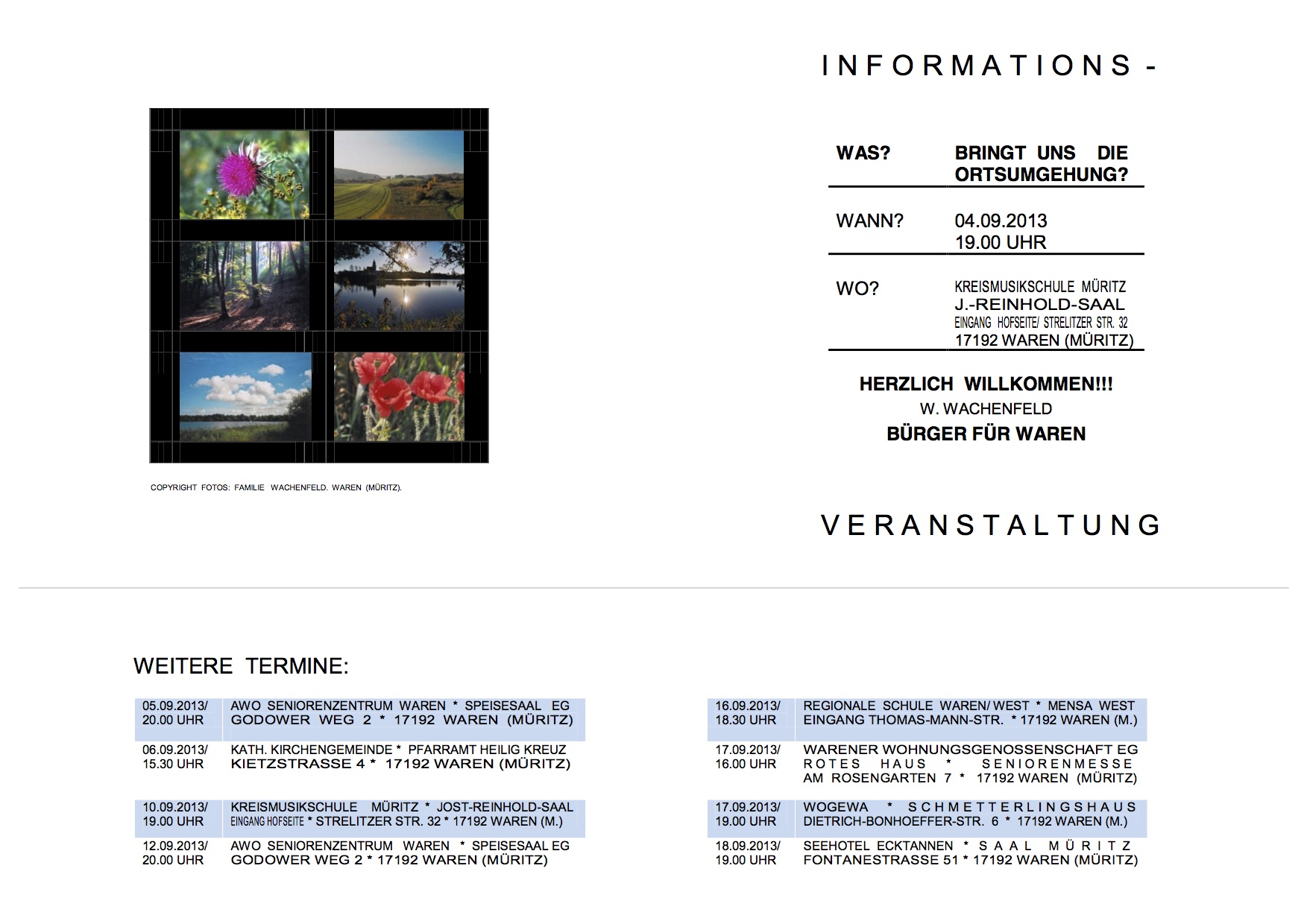 Waren. In den kommenden Tagen und Wochen gibt es weitere Infoveranstaltungen zur Ortsumgehung, organisiert von Werner Wachenfeld unter dem Motto „Bürger für Waren“.