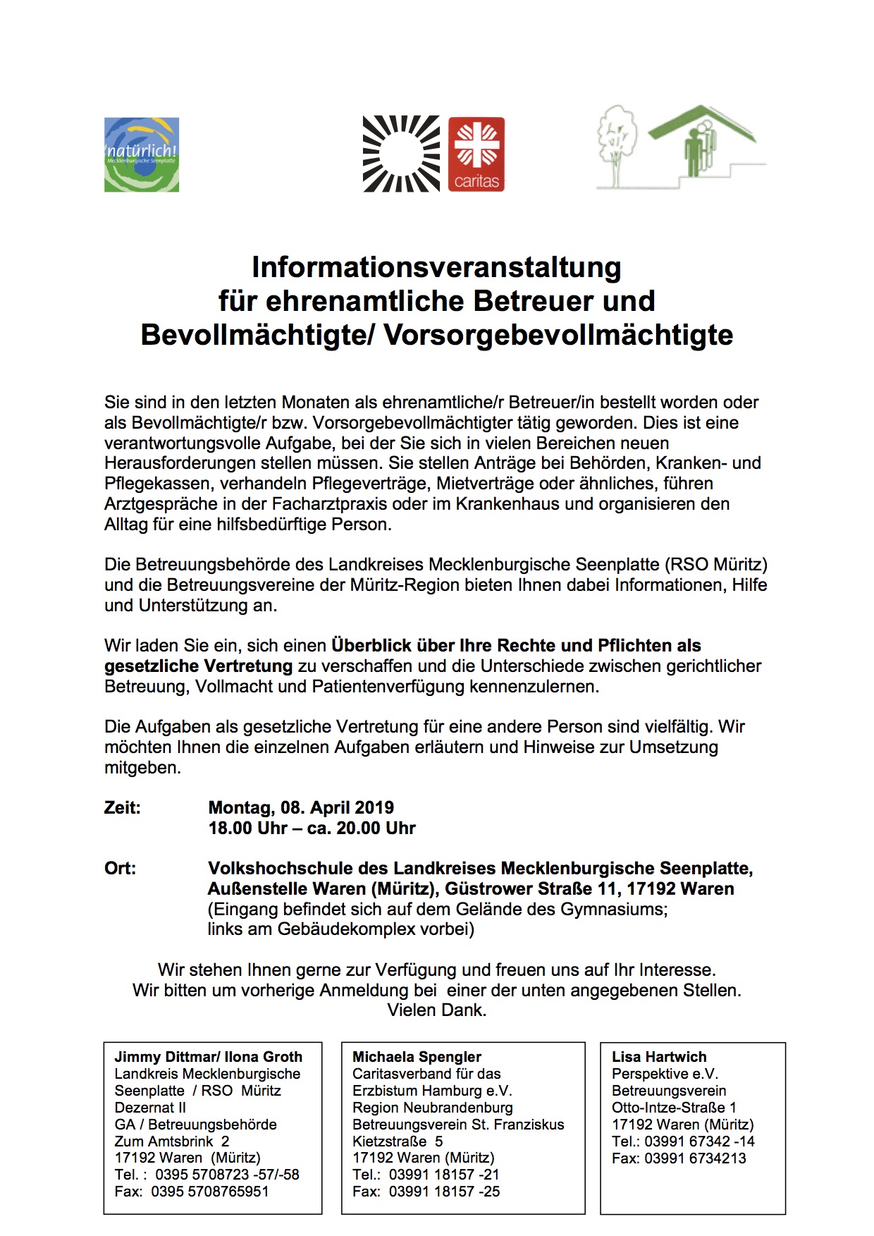 Eine Informationsveranstaltung für ehrenamtliche Betreuer und Bevollmächtigte ist für den 8. April in der Volkshochschule Waren geplant. Dabei erhalten die Ehrenamtlichen einen Überblick übe ihre Rechte und Pflichten als gesetzliche Vertretung.