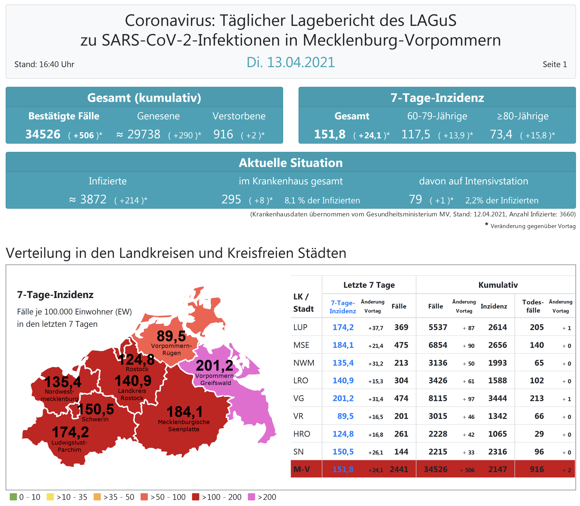 Der Inzidenzwert für ganz Mecklenburg-Vorpommern ist ebenfalls deutlich gestiegen und liegt heute bei 151,8 (gestern 127,7). Insgesamt meldet das Land Mecklenburg-Vorpommern heute 506 Neuinfektionen.