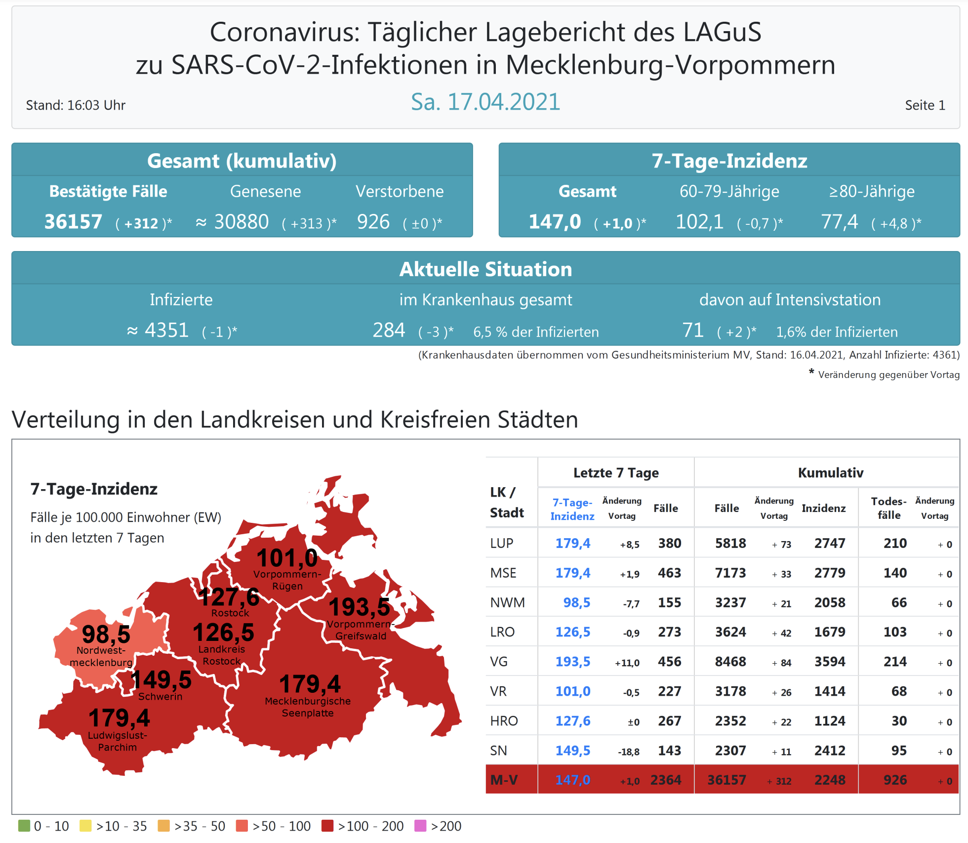 Der Inzidenzwert für ganz Mecklenburg-Vorpommern ist leicht gestiegen und liegt heute bei 147 (gestern 146). Insgesamt meldet das Land Mecklenburg-Vorpommern heute 312 Neuinfektionen.