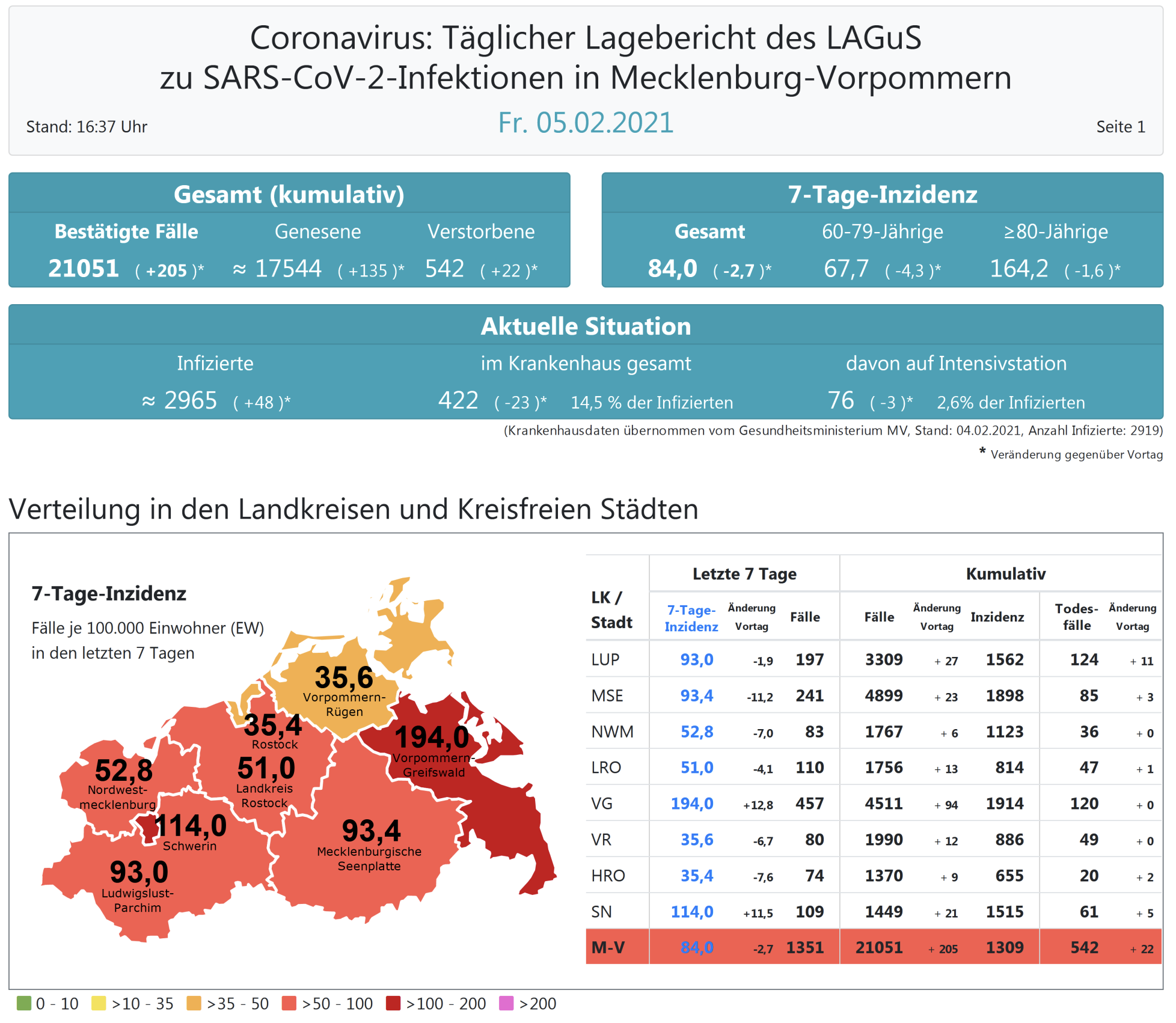Der Inzidenzwert für ganz Mecklenburg-Vorpommern liegt heute bei 84,0 (gestern 86,8). Insgesamt meldet das Land Mecklenburg-Vorpommern heute 205 Neuinfektionen.