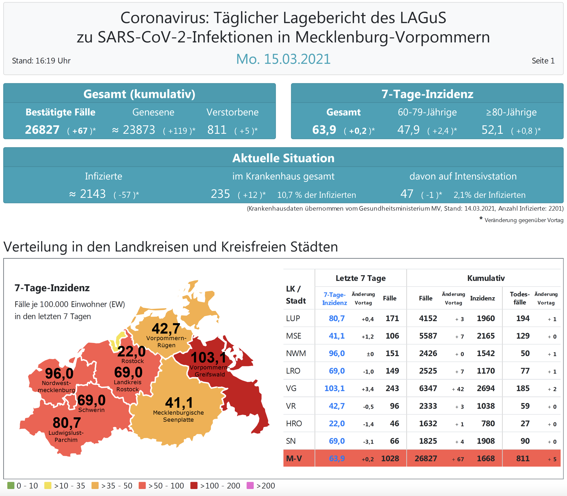Der Inzidenzwert für ganz Mecklenburg-Vorpommern ist ganz leicht gestiegen und liegt heute bei 63,9 (gestern 63,8 ). Insgesamt meldet das Land Mecklenburg-Vorpommern heute 67 Neuinfektionen. Die höchste Inzidenz hat der Landkreis Vorpommern-Greifswald mit heute 103,7.