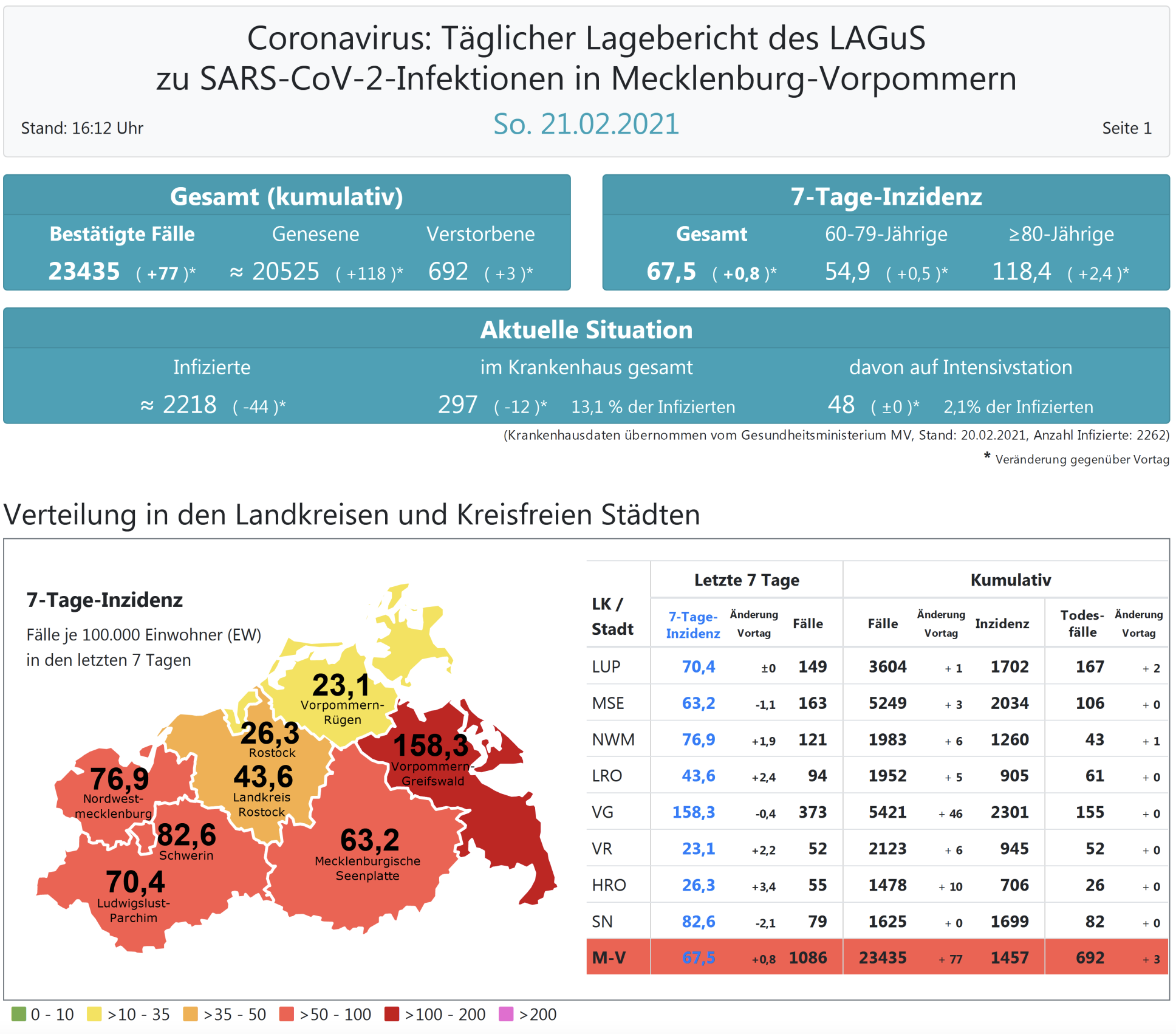 Der Inzidenzwert für ganz Mecklenburg-Vorpommern ist leicht gestiegen und liegt heute bei 67,5 (gestern 66,7). Insgesamt meldet das Land Mecklenburg-Vorpommern heute 77 Neuinfektionen. Die höchste Inzidenz hat nach wie vor der Landkreis Vorpommern-Greifswald mit jetzt 158,3.