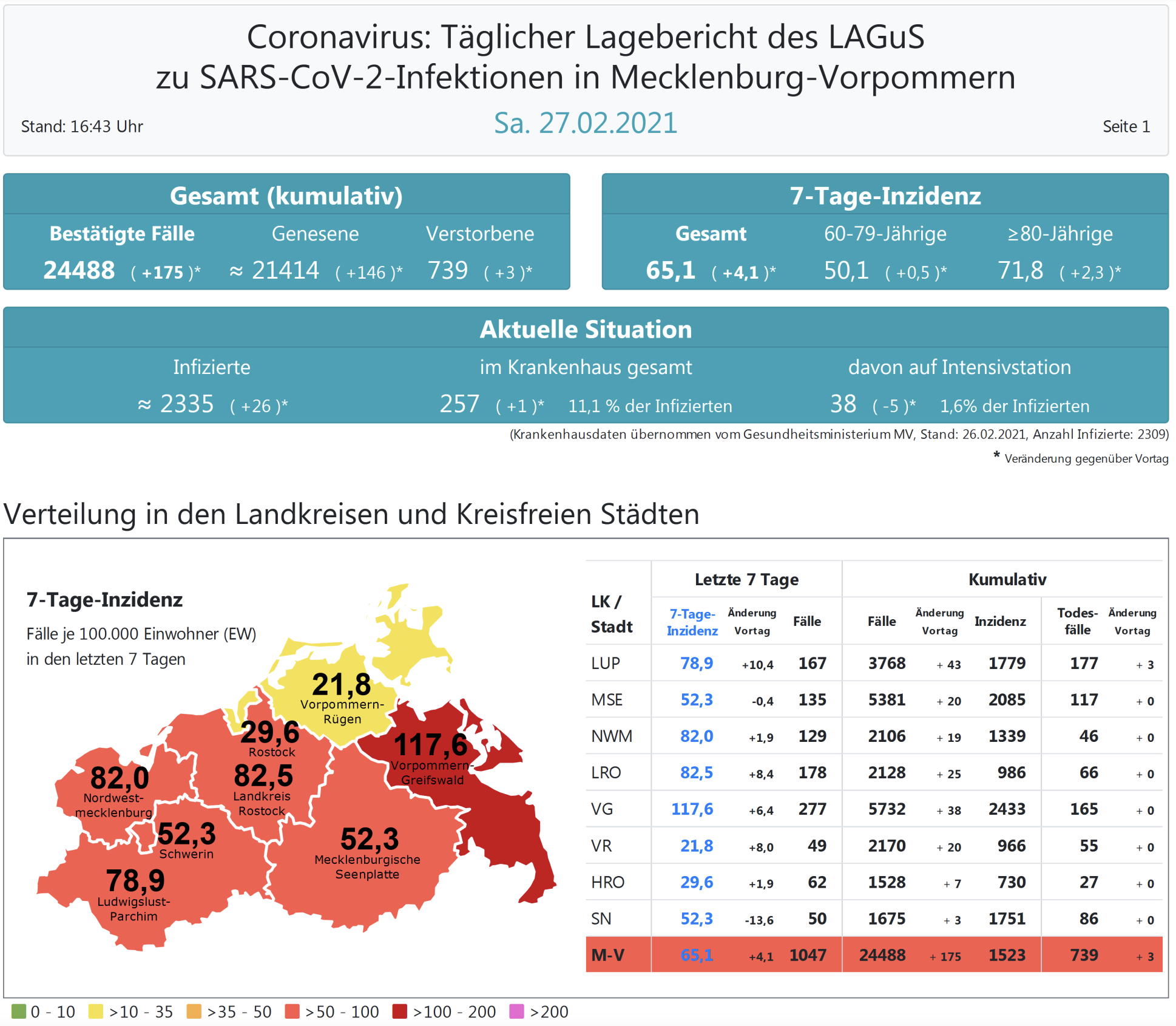 Der Inzidenzwert für ganz Mecklenburg-Vorpommern ist wieder gestiegen und liegt heute bei 65,1 (gestern 61,0 ). Insgesamt meldet das Land Mecklenburg-Vorpommern heute 175 Neuinfektionen. Die höchste Inzidenz hat nach wie vor der Landkreis Vorpommern-Greifswald mit jetzt 117,6.