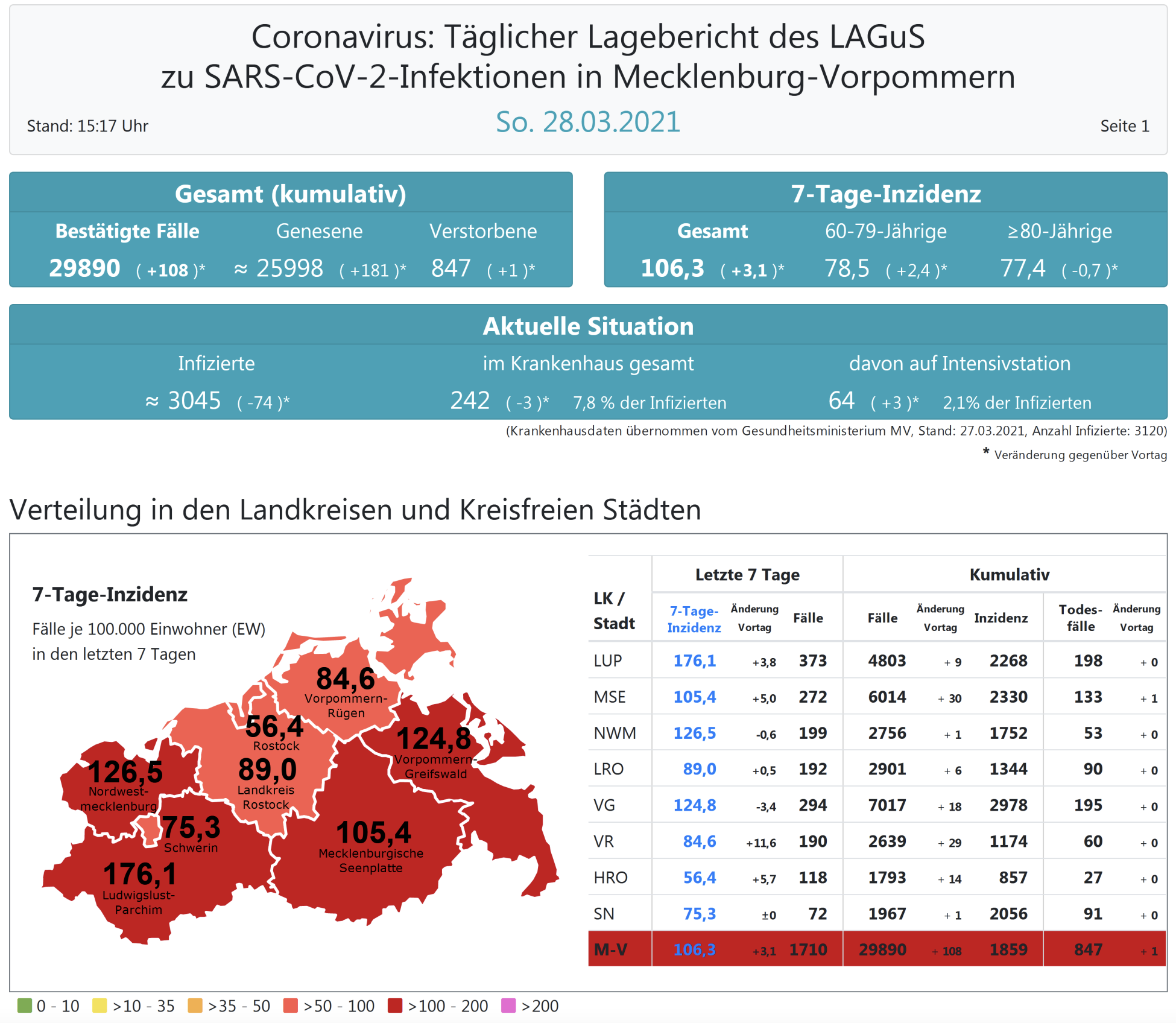 Der Inzidenzwert für ganz Mecklenburg-Vorpommern liegt ebenfalls weiter über 100 – genau bei 106,3 (gestern 103,2). Insgesamt meldet das Land Mecklenburg-Vorpommern heute 108 Neuinfektionen. Die höchste Inzidenz hat der Landkreis Ludwigslust-Parchim mit heute 176,1.