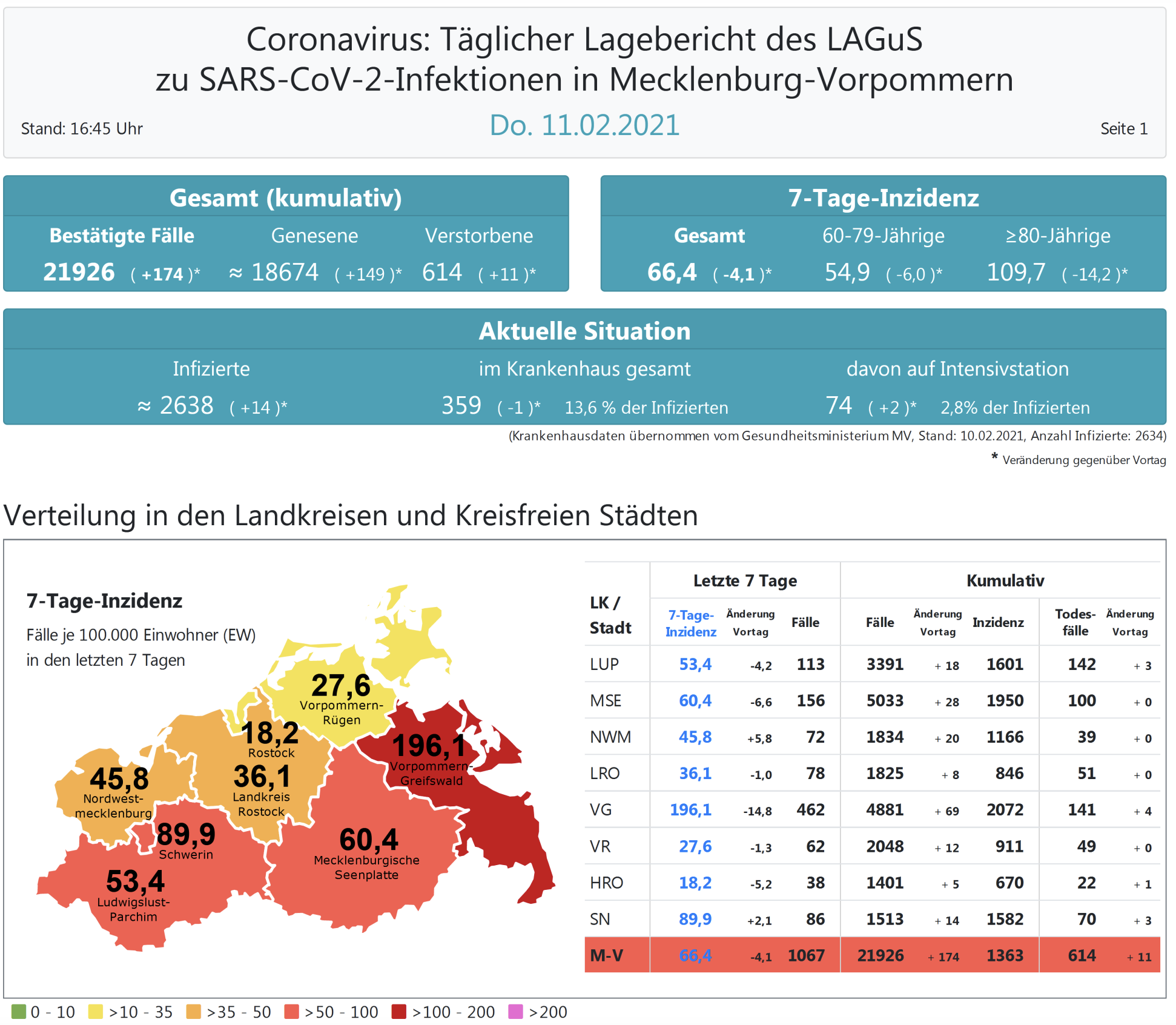 Der Inzidenzwert für ganz Mecklenburg-Vorpommern liegt heute bei 66,4 (gestern 70,7). Insgesamt meldet das Land Mecklenburg-Vorpommern heute 207 Neuinfektionen. Der Landkreis Vorpommern-Greifswald hat heute erstmals seit Tagen eine Inzidenz unter 200.