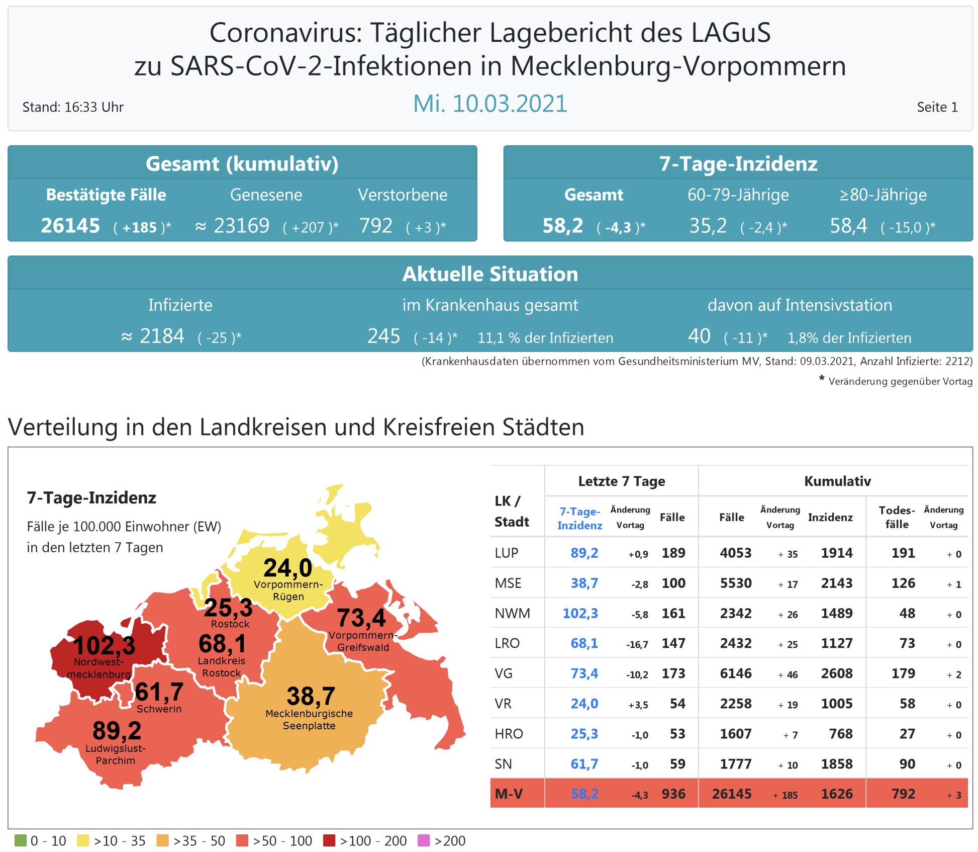 Der Inzidenzwert für ganz Mecklenburg-Vorpommern ist ebenfalls gesunken und liegt heute bei 58,2 (gestern 62,5 ). Insgesamt meldet das Land Mecklenburg-Vorpommern heute 185 Neuinfektionen. Die höchste Inzidenz hat der Landkreis Nordwestmecklenburg mit heute 102,3.