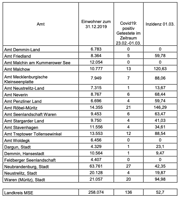 Der Landkreis Mecklenburgische Seenplatte hat heute wieder die Inzidenzwerte für die einzelnen Städte und Ämter veröffentlicht. Danach hat hat das Amt Röbel-Müritz mit 146,29 derzeit den höchsten Inzidenzwert im Kreis, gefolgt vom Amt Malchow mit 120,63 und der Stadt Waren mit 94,98.