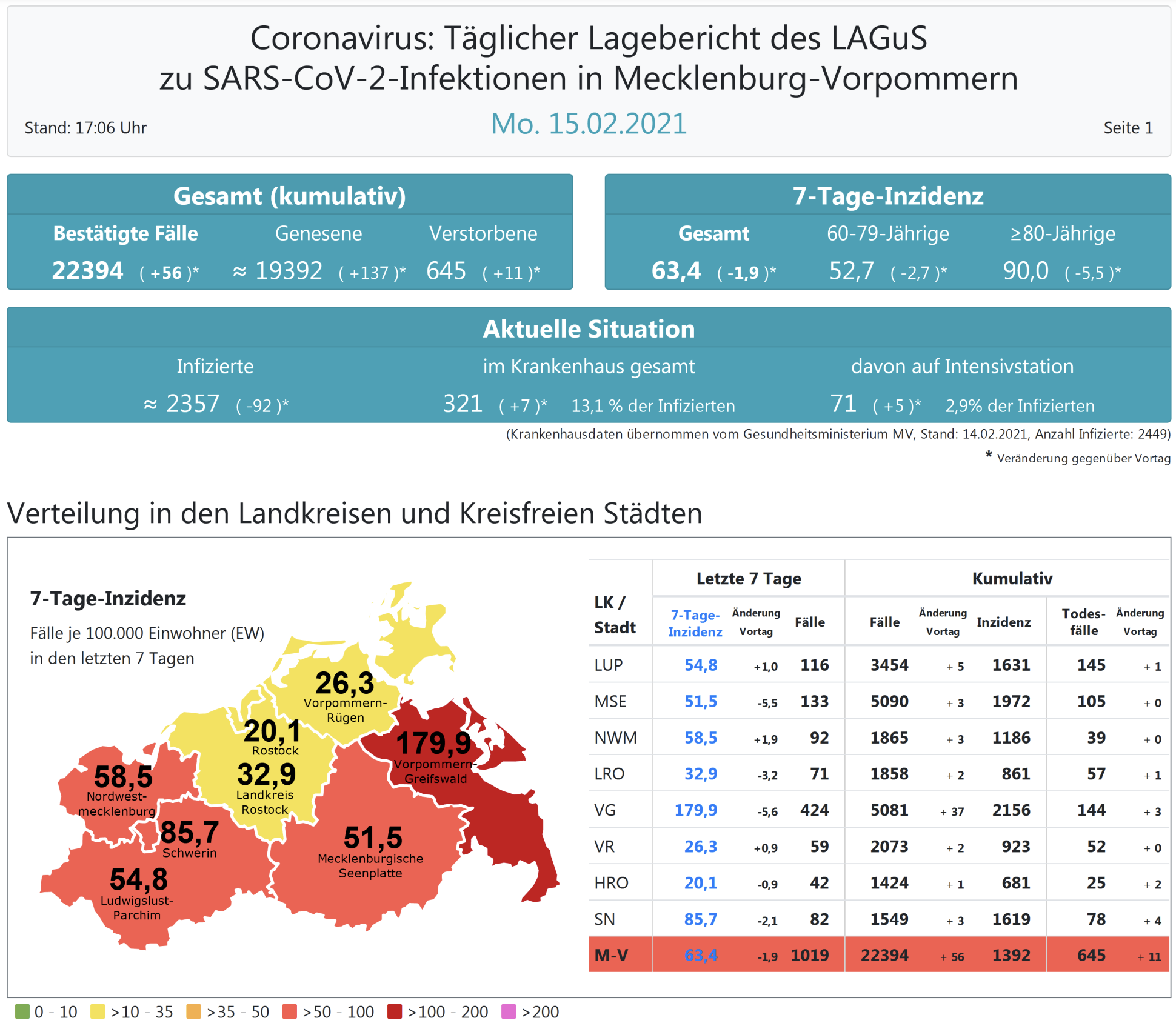 Der Inzidenzwert für ganz Mecklenburg-Vorpommern liegt heute bei 63,4 (gestern 65,3). Insgesamt meldet das Land Mecklenburg-Vorpommern heute 56 Neuinfektionen. Die höchste Inzidenz hat nach wie vor der Landkreis Vorpommern-Greifswald mit jetzt 179,9.