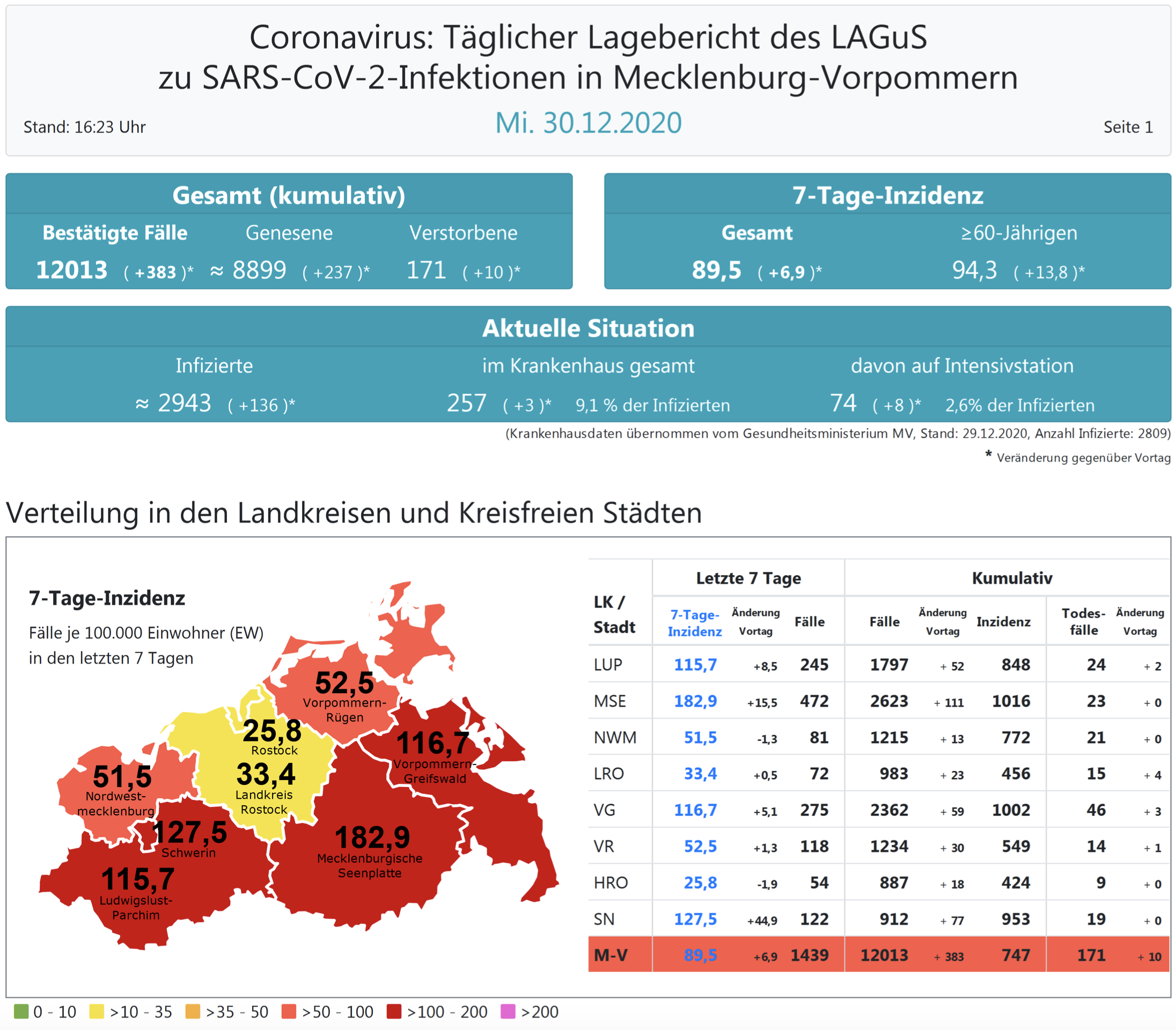Insgesamt wurden in Mecklenburg-Vorpommern bisher 12 013 Infektionen festgestellt. Im Land gab es bislang 171 Todesfälle, zehn mehr als gestern.