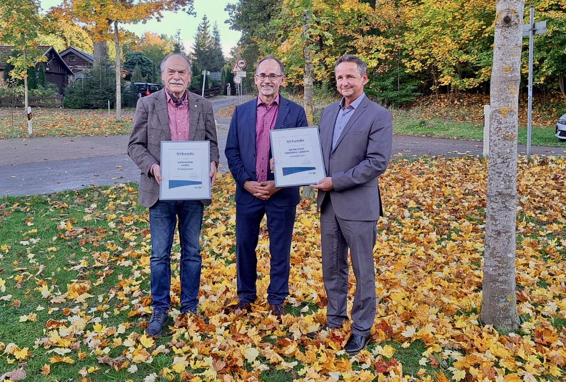 Foto: Die Bürgermeister der Gemeinden Jabel und Göhren-Lebbin, Johannes Güssmer (links) und Torsten Zillmer (rechts) haben gestern die Urkunden für die Anerkennung als Tourismusort von Wirtschaftsminister Wolfgang Blank erhalten.