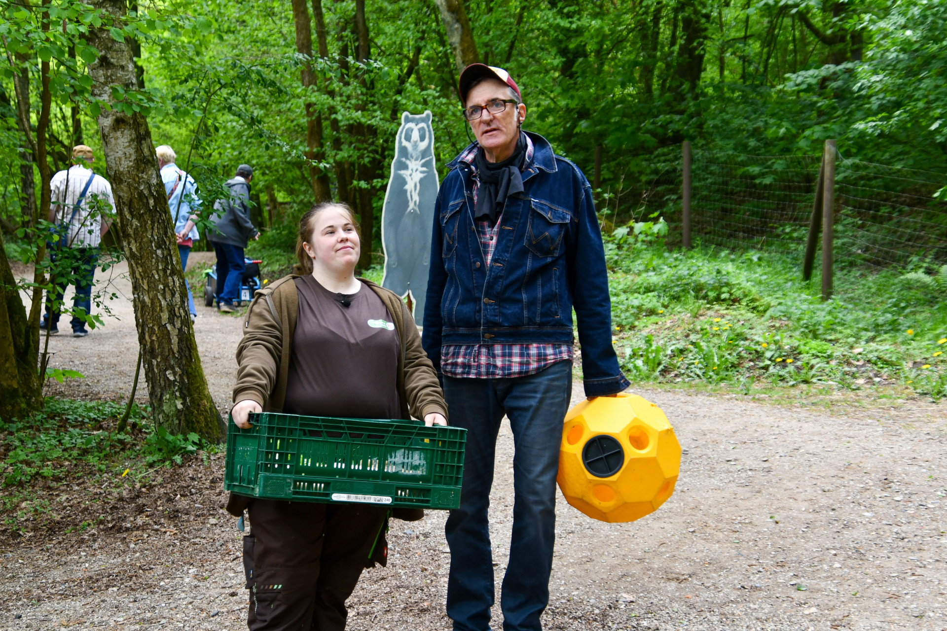 Foto oben: Tierpflegerin Susanne Penschke und Andreas Hoppe auf dem Weg zur Bären-Fütterung.