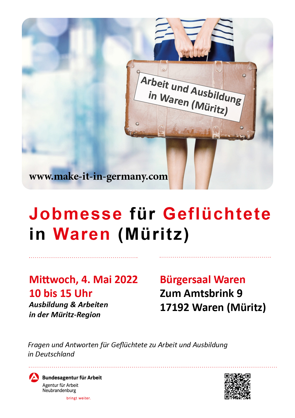 Unternehmen und Menschen, die in der Mecklenburgischen Seenplatte Schutz gefunden haben, zusammenbringen – dieses Ziel verfolgt die Jobmesse für Geflüchtete, die am 4. Mai in Waren stattfindet. Die in ihrer Art erste Berufs- und Ausbildungsmesse ist ein Gemeinschaftsprojekt in der Seenplatte und soll Geflüchteten mit Bleibe-Perspektive die Stellen- und Ausbildungsplatzsuche erleichtern. Die 28 teilnehmenden Unternehmen kommen aus unterschiedlichen Branchen wie Industrie, Handel, Verkehr/Schifffahrt, Pflege, IT-Bereich sowie dem Hotel- und Gastgewerbe. Ideengeber ist der Geschäftsführer des Hotel Amsee in Waren Hannes Thies.