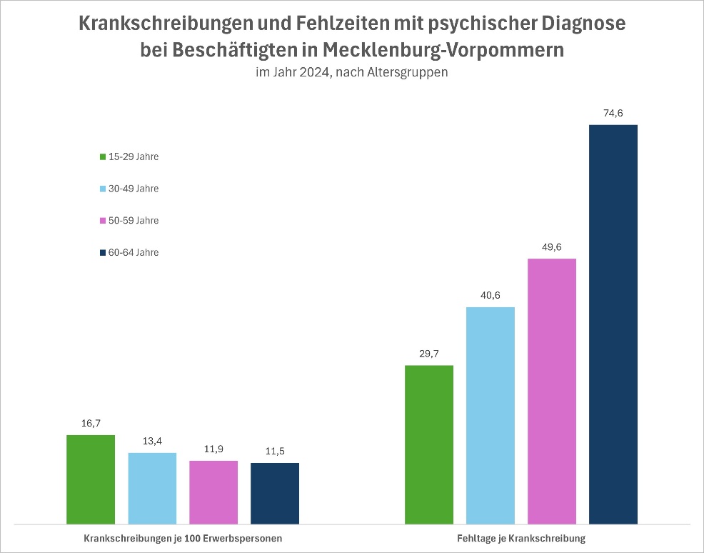 Die häufigste psychische Diagnose, aufgrund dessen in Mecklenburg-Vorpommern im Jahr 2024 eine Krankschreibung erfolgte, waren Belastungsstörungen. Dazu gehören zum Beispiel die akute oder posttraumatische Belastungsreaktion (PTBS). Die zweithäufigste Ursache waren Depressionen, gefolgt von somatoformen Störungen wie zum Beispiel dem chronischen Schmerzsyndrom. Es zeigen sich laut Analyse keine Unterschiede bei jüngeren oder älteren Beschäftigten.