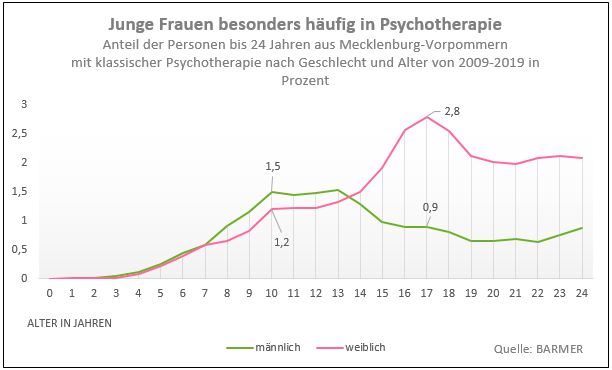 Junge Frauen im Alter von 17 Jahren sind besonders häufig in psychotherapeutischer Behandlung. Dies ist das Ergebnis einer Analyse der BARMER unter Kindern, Jugendlichen und jungen Erwachsenen bis 24 Jahren. Von 2009 bis 2019 nahmen hochgerechnet rund 1.940 der 17-jährigen Frauen aus Mecklenburg-Vorpommern eine klassische Psychotherapie, auch Richtlinientherapie genannt, in Anspruch. Das sind 2,8 Prozent der jungen Frauen in diesem Alter. Damit ist der Anteil dreimal so hoch wie bei den gleichaltrigen männlichen Jugendlichen mit 0,9 Prozent oder hochgerechnet rund 660 Betroffenen im selben Zeitraum.