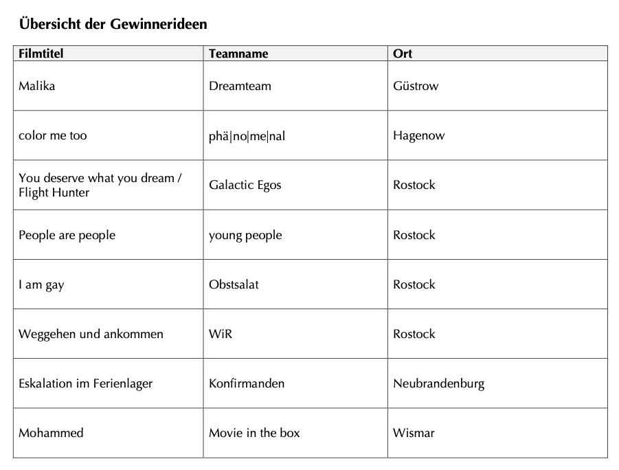 Mit Beginn des Schuljahres hatte die Regionale Arbeitsstelle für Bildung, Integration und Demokratie (RAA) Mecklenburg-Vorpommern e. V. im Rahmen ihres Projektes „Klappe auf!“ landesweit Kinder und Jugendliche im Alter von 12 bis 25 Jahren eingeladen, sich mit eigenen Filmideen für Vielfalt, Zivilcourage und Respekt zu engagieren und damit ein Zeichen gegen Rassismus und Diskriminierung zu setzen. Ende September 2021 endete die Bewerbungsfrist für den Wettbewerb, der sich aus der Vielzahl von Filmwettbewerben dadurch heraushebt, dass hier nicht fertige Filme, sondern Filmideen junger Menschen, prämiert werden.