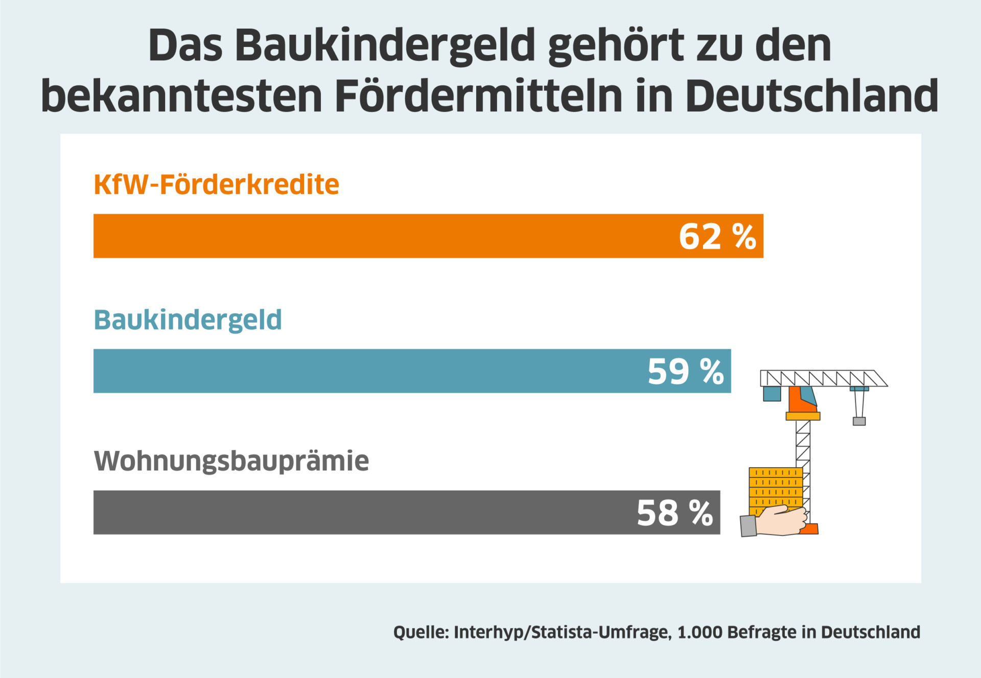Laut Interhyp gehört das Baukindergeld zu den bekanntesten Fördermitteln in Deutschland. Laut einer repräsentativen Erhebung von Statista im Auftrag der Interhyp AG im Jahr 2020 kennen 59 Prozent der Deutschen das Baukindergeld. Es steht damit an zweiter Stelle der Bekanntheit, knapp hinter den KfW-Förderkrediten, die 62 Prozent der Deutschen kennen. Mirjam Mohr: „Unsere Untersuchung zeigt, dass viele Menschen den Staat durchaus in der Verantwortung sehen, den Erwerb von Wohneigentum zu unterstützen.“ Drei Viertel der Deutschen finden laut der Interhyp-Umfrage, dass der Staat den Erwerb von Wohneigentum schon heute nicht ausreichend unterstützt. 62 Prozent der Befragten wünschen sich zusätzliche finanzielle Anreize aufgrund der Corona-Krise. Mirjam Mohr: „Die Wohneigentumsquote ist in Deutschland im Vergleich zu anderen europäischen Ländern immer noch niedrig. Dabei ist Wohneigentum für die Altersvorsorge und auch für mehr soziale Gleichheit wichtig. Der Weg ins eigene Zuhause muss auch künftig einer breiten Bevölkerungsschicht möglich sein“, sagt die Expertin.