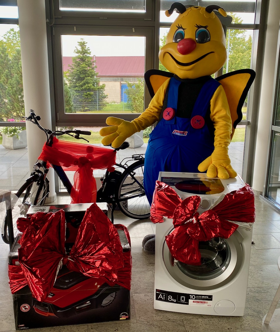 Und hier die Gewinner der Hauptpreise: Das E-Bike hat Herr Wolter aus Neu Schloen gewonnen. Der Rasenmähroboter geht an Herrn Nicolaus nach Penzlin. Und die Waschmaschine bleibt in Waren – darüber kann sich Frau Wiegmann freuen.