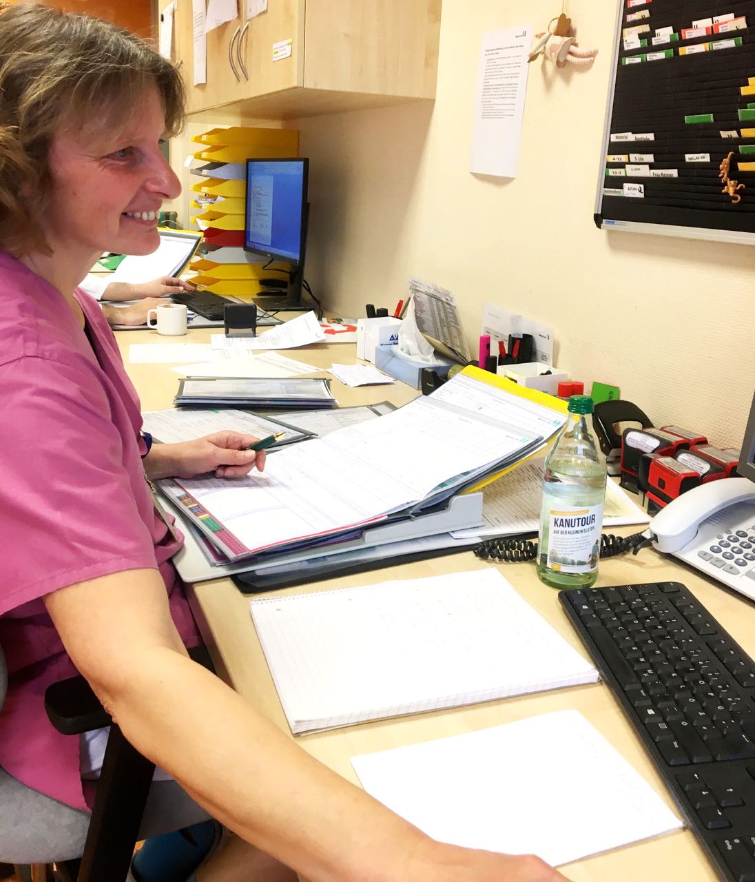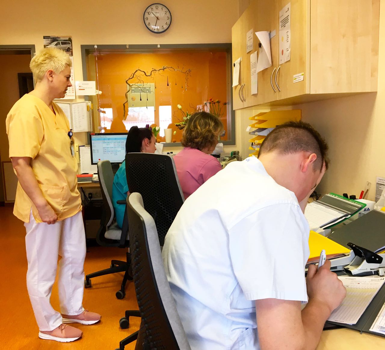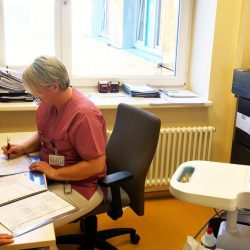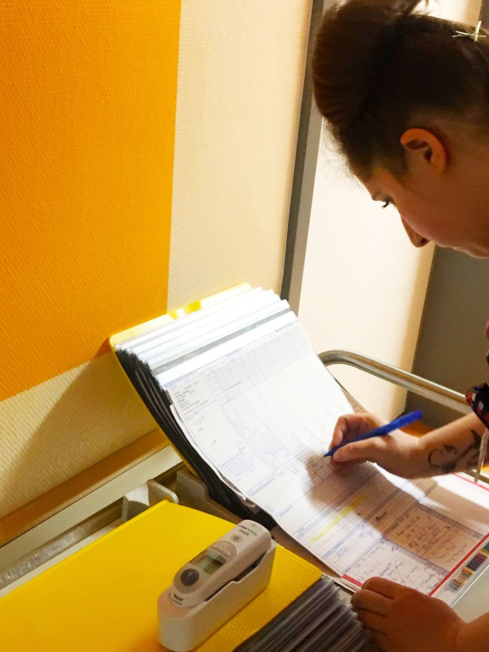 Zurück im Schwesternzimmer muss die Bürokratie erledigt werden. In den Patientenbögen wird alles dokumentiert, was in den Zimmern verabreicht und an den Wunden beobachtet wurde. Zwischendurch huschen immer wieder Kollegen über den Flur und transportieren Patienten zu ihren Untersuchungen oder Operationen. Zudem fällt mir auf, dass am laufenden Band das Telefon auf der Station klingelt und Ärzte und Angehörige am Stationszimmer vorbei kommen und die Schwestern Rede und Antwort stehen müssen.