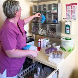 Je nachdem, wieviel Zeit am Morgen bleibt, werden die Bestände in den Behandlungsräumen aufgefüllt, Verfallsdaten der einzelnen Produkte werden geprüft und neue medizinische Artikel wie zum Beispiel Tupfer, Blutentnahmeröhrchen und Pflaster nachbestellt. Dafür ist an diesem Morgen jedoch keine Zeit. Es müssen Vorbereitungen für die Sprechstunde von Dr. Kay Scheffler, Facharzt für Urologie, getätigt waren. Verschiedene Utensilien, wie Desinfektionsmittel, Skalpelle, Tupfer und Pflaster werden für den Arzt griffbereit für die ambulanten Behandlungen hingestellt.