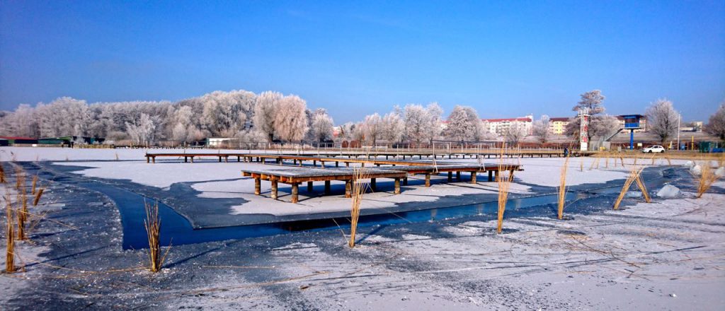 Schwimmmeister Jörg Felgner hatte die Stadtbauhof-Mitarbeiter angefordert. Ob noch weitere Stege einen Schutzstreifen erhalten, war bis zuletzt noch nicht sicher. Auf dem Eis waren schon kurz nach dem Aufschneiden dumpfes Knallen und ein Eis-Knarren zu hören, das signalisierte, wie sich der Eispanzer bei Sonne bewegt.