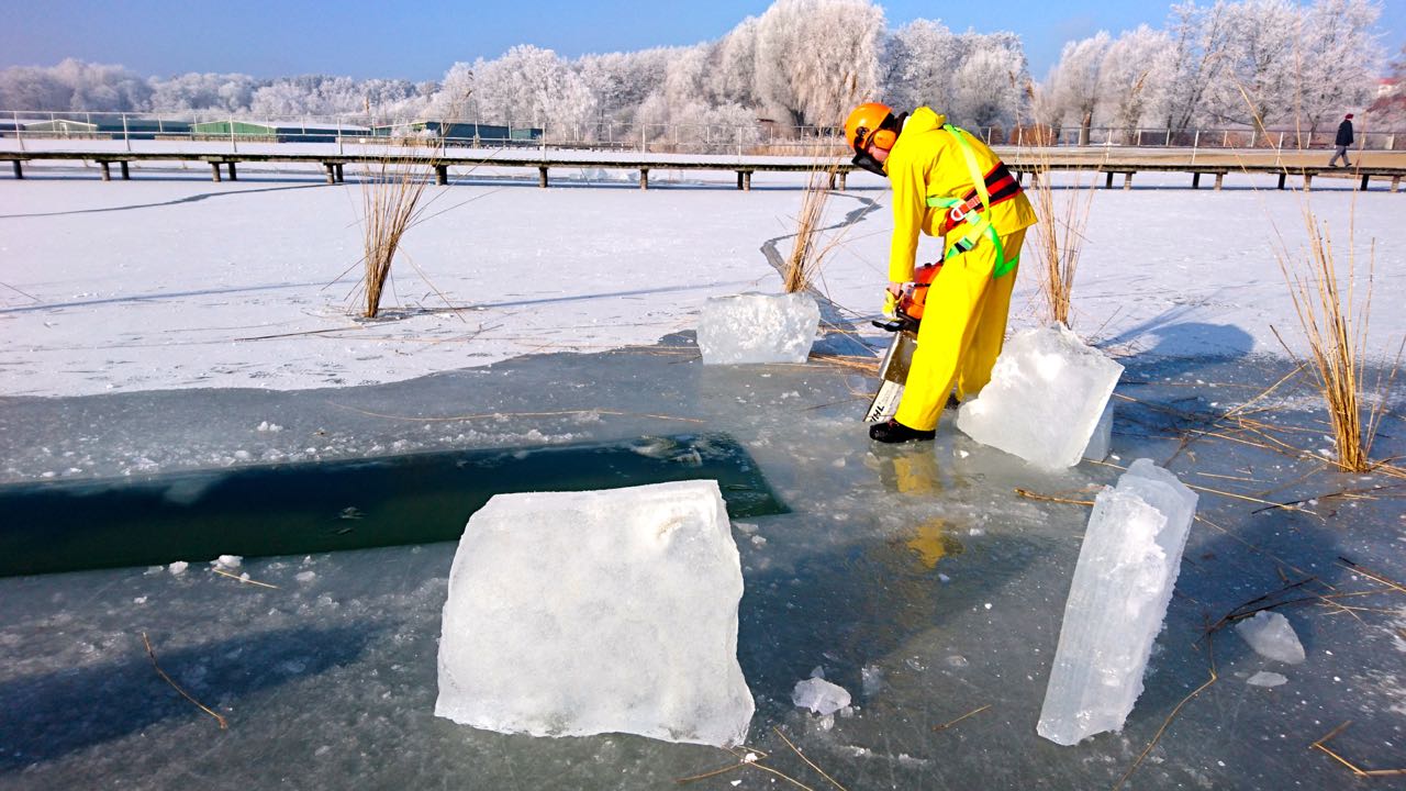 Ich denke, es egt darum zu verhindern, dass der Steg durch die Eisbewegung Schaden nimmt. Ist es da nicht recht spät, das Eis aufzuschneiden, wenn es so dick ist und für die nächsten Tage Tauwetter angesagt ist? Manche privaten Stegbesitzer sind da schneller dabei und quälen sich dann nicht so.