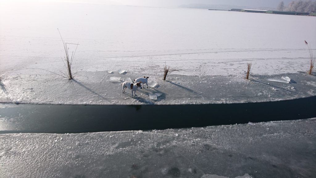 Kurz nachdem die Arbeiter den Steg freigeschnitten hatten, wurden mit einer Art Axt Löcher in das etwa 16 Zentimeter dicke Eis geschlagen und Schilf hineingesteckt. Als Warnung. Wenige Minuten später kamen bereits die ersten Neugierigen, darunter auch zwei Hunde samt Besitzer.
