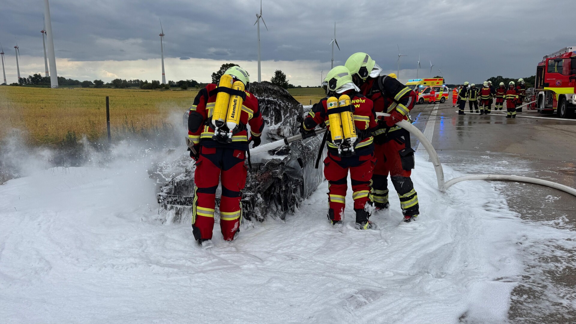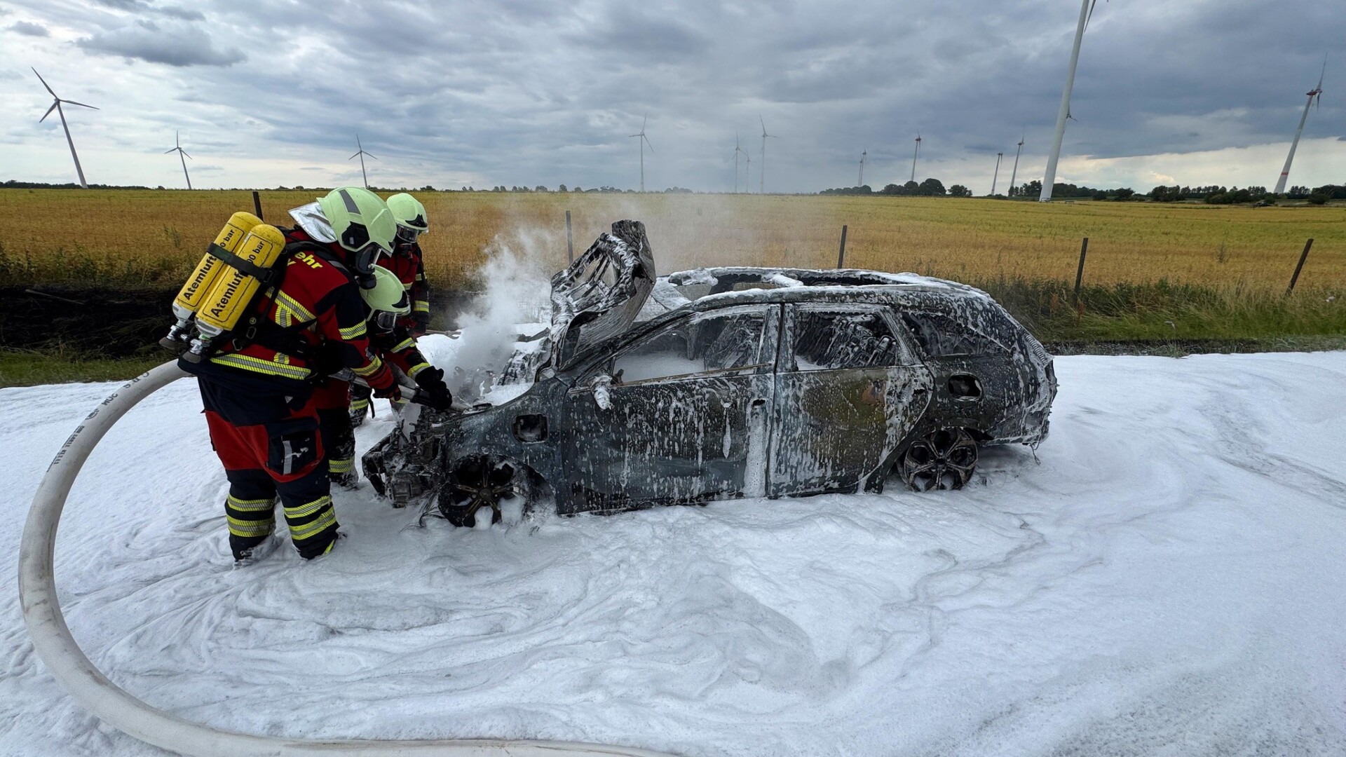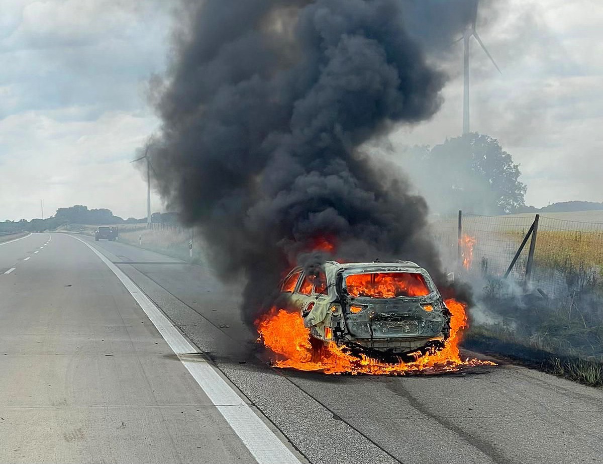 Heute Nachmittag ist auf der A 19 zwischen Wittstock und Röbel in Richtung Rostock ein Kia Ceed – ein Hybridfahrzeug – nach einem Unfall in Flammen aufgegangen. Nach Polizeiinformationen wechselte der Fahrer, der alleine im Pkw war, vom rechten auf den linken Fahrstreifen, ohne auf den nachfolgenden Verkehr zu achten. Der Kia touchierte einen auf der Überholspur fahrenden Ford Ranger, drehte sich um die eigene Achse, beschädigte dabei auf 40 Metern Länge die Mittelschutzplanke und kam auf dem Standstreifen zum Stehen. Dort fing der Kia an zu brennen. Der Fahrer konnte sich aus dem Auto retten und blieb unverletzt. Auch die beiden Insassen in dem Ford blieben unverletzt und konnten nach kurzer Zeit die Unfallstelle wieder verlassen. Das Feuer griff auf die angrenzende Böschung über. Durch die schnell am Unfallort eintreffende Feuerwehr konnte ein Ausbreiten des Brandes auf ein angrenzendes Getreidefeld verhindert werden. Der Gesamtschaden wird auf 50.000Euro geschätzt. Die Autobahn war für ca. zwei Stunden in Fahrtrichtung Rostock voll gesperrt.