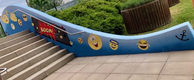 Und so finden sich die lustigen Kumpane nun mit Lachtränen oder Heiligenschein oder auch als Verliebtheit-Emoji direkt auf dem Betonteil am Eingangsbereich zum Hort. Und natürlich darf auch der kleine braune Haufen mit Augen nicht fehlen.