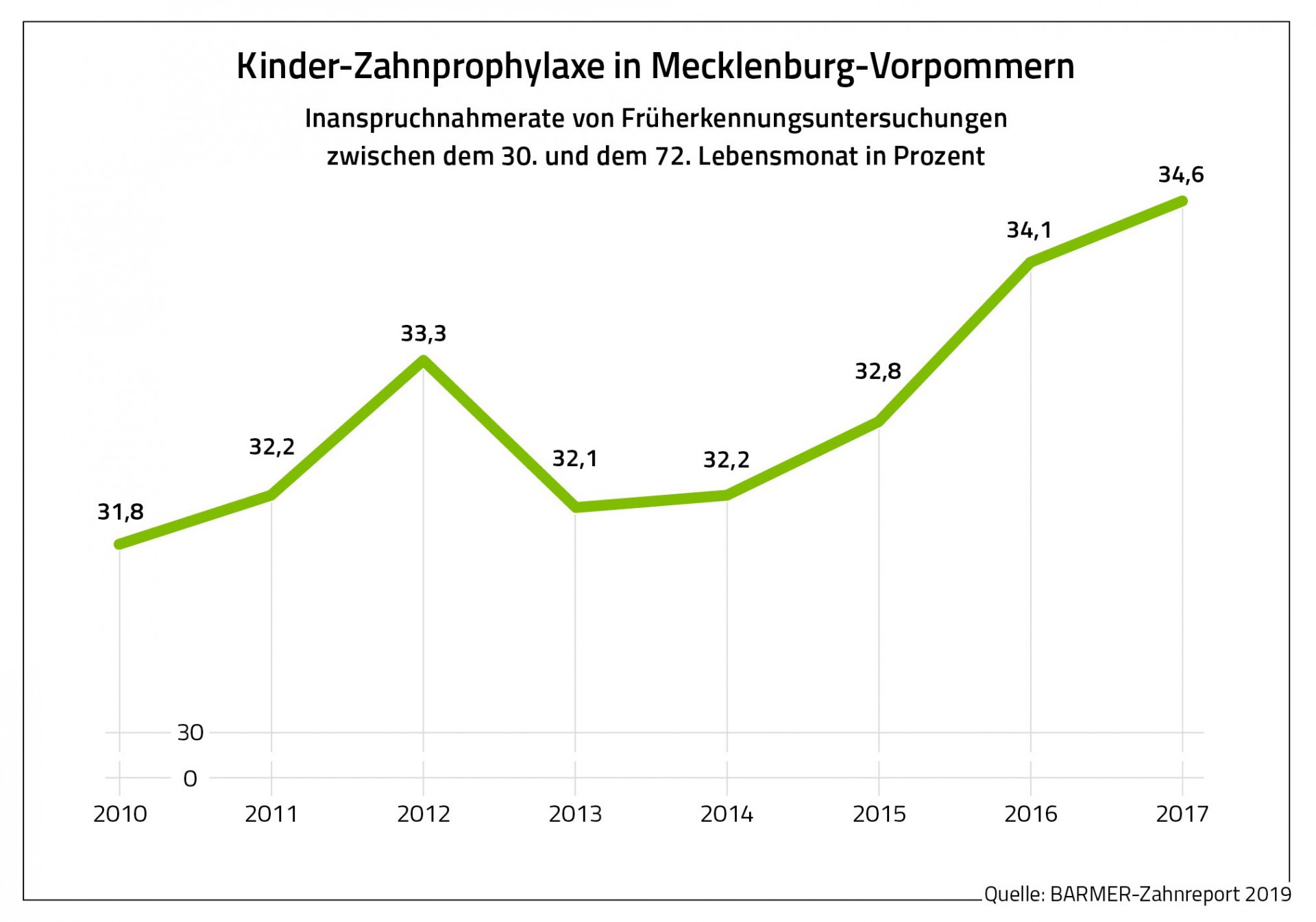 Drei von Vier (75,3 Prozent) haben 2017 mindestens einmal zahnärztliche Leistungen in Anspruch genommen. Bundesweit gehen 71,5 Prozent regelmäßig zum Zahnarzt. „Bei der zahnmedizinischen Versorgung gibt es laut BARMER Zahnreport große regionale Unterschiede. Der Osten Deutschlands ist viel häufiger beim Zahnarzt als der Westen“, erklärt der BARMER-Landeschef. Mit zusätzlichen zahnärztlichen Früherkennungsuntersuchungen beginnend im Säuglingsalter will die Krankenkasse Kinder frühzeitig mit dem Besuch beim Zahnarzt vertraut machen.