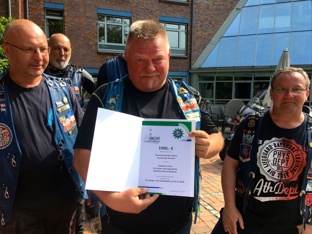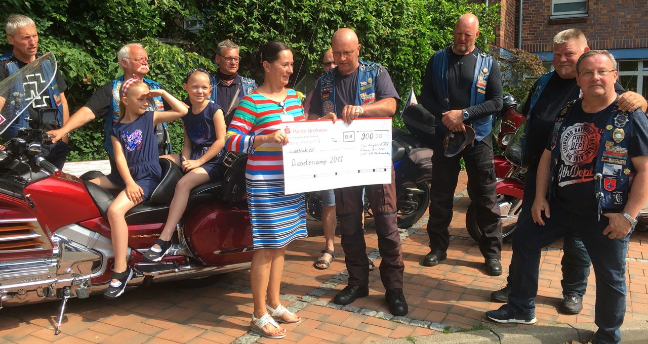 Die wohl spektakulärste Übergabe der Spendengelder ist sicherlich immer die, der motorradfahrenden Polizisten und Feuerwehrleute aus MV, die Blue Knights und die Flaming Stars. Mitte Juni übergaben sie den Spendenscheck in Höhe von 900 Euro an Dr. Kathrin Hake, Chefärztin der Klinik für Kinder- und Jugendmedizin des MEDICLIN Müritz-Klinikums und Initiatorin des Camps. Die Polizeigewerkschaft spendete zudem noch weitere 1000 Euro. Es ist inzwischen eine richtige Tradition geworden, dass sie einmal im Jahr mit lautem Geknatter auf das Gelände des MediClin Müritz-Klinikums fahren. Ebenso wie das Camp fand nämlich auch die Spendenübergabe bereits zum siebten Mal statt. Die Motoradclubs sind von Anfang an feste Sponsoren.