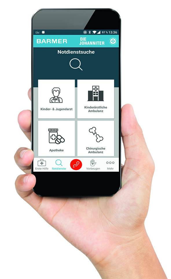 Über die neue Kindernotfall-App lässt sich im Notfall direkt ein Notruf absetzen. Eine Suchfunktion ermöglicht es, schnell die nächsten Krankenhäuser, Ärzte oder Apotheken zu finden.