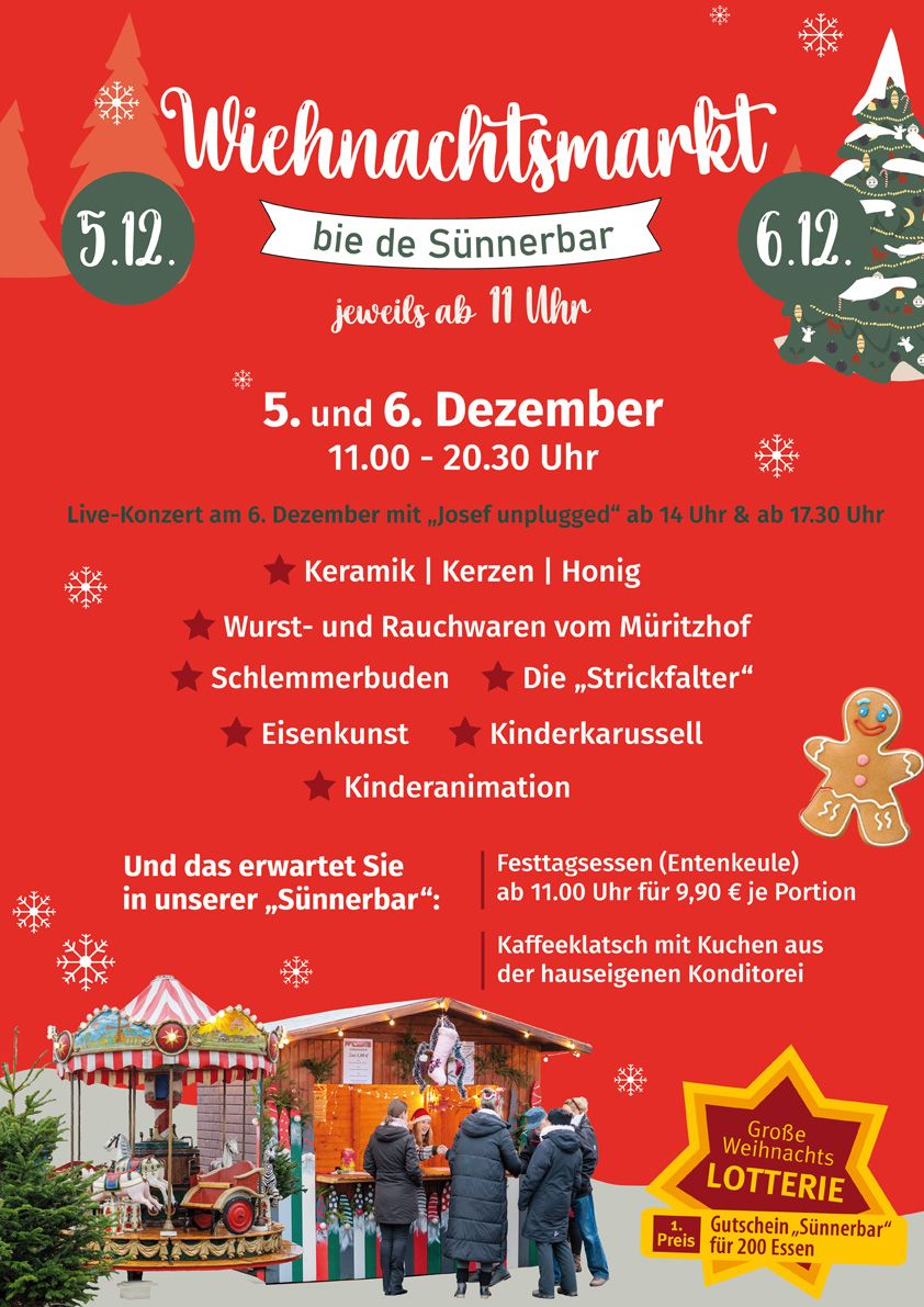 Die Lotterie für den sozialen Zweck fehlt selbstverständlich auch nicht. Der Erlös kommt den Wohneinrichtungen des Lebenshilfswerkes zugute, zu gewinnen gibt’s Gutscheine für die „Sünnerbar“. Lose dafür kann man sich übrigens schon im Vorfeld sichern. Einfach eine Mail mit dem Stichwort „Weihnachtsmarkt-Lose“ an info@lebenshilfswerk-waren.de schicken.