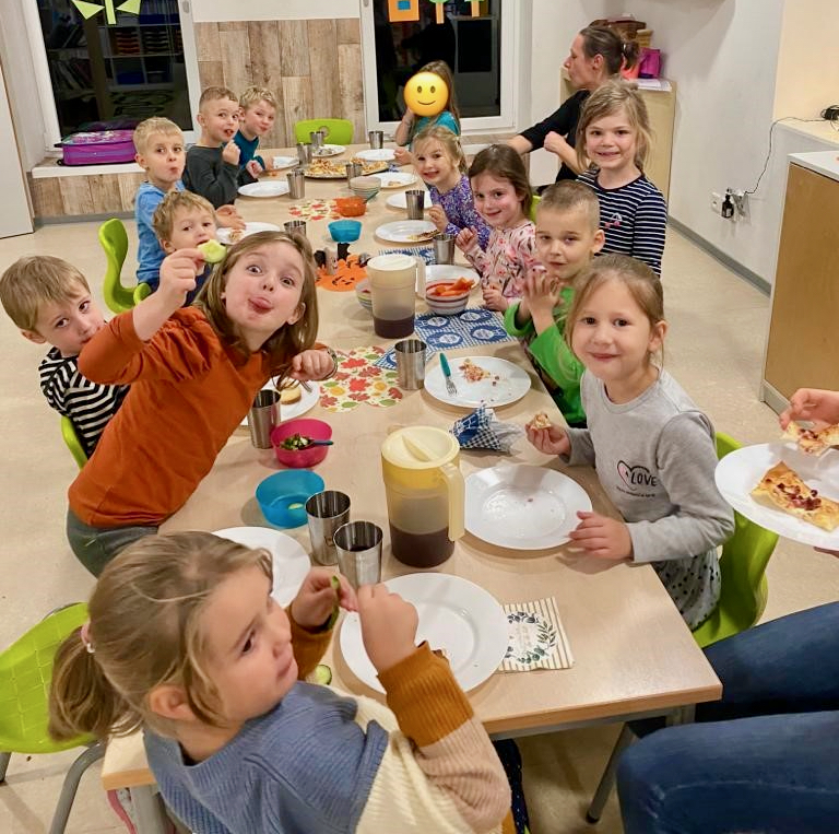 Zunächst wurde da wo tagsüber sonst die Krippenkinder spielen, ein gemütliches Bettenlager errichtet. Schon beim Errichten flog ein herrlicher Duft von Flammkuchen durch die Räume. Nach getaner Arbeit und anschließender Spielzeit, machten sich die Knirpse über den leckeren Flammkuchen her. Als Nachtisch gab es Wackelpudding. Was sonst, wenn die Kinder wählen dürfen? Manch einer bekam aber keinen Bissen herunter, denn die Aufregung war groß. Wussten doch alle, dass noch eine Überraschung auf sie wartete. Was genau, blieb noch geheim.