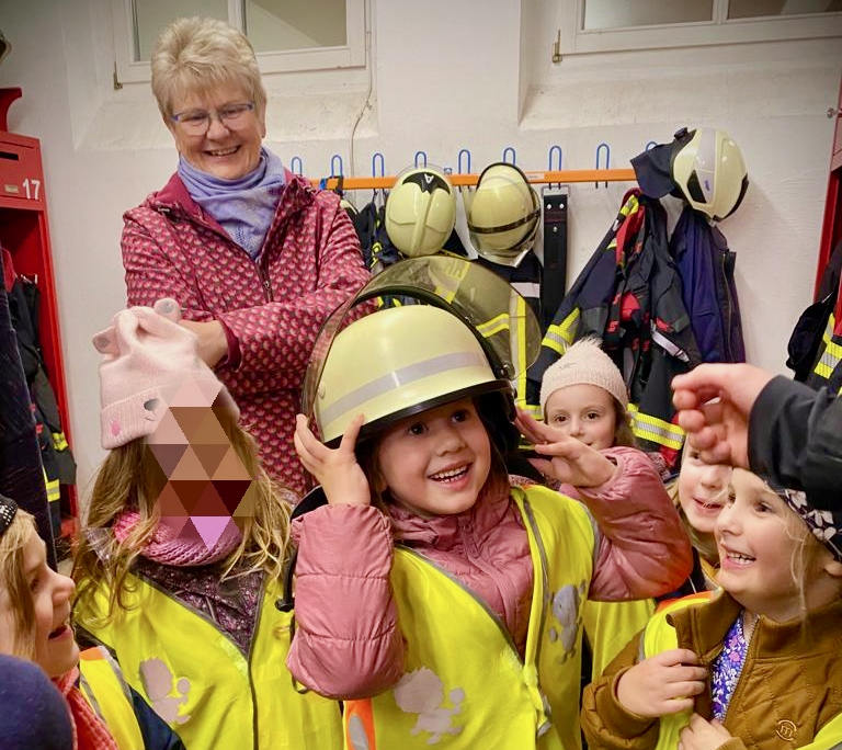 Gegen 18.30 Uhr ging es dann, warm eingepackt und mit leuchtenden Warnwesten ausgestattet, zu Fuß los. Wohin der Fußmarsch gehen sollte, blieb weiterhin im Verborgenen. Die Kinder rätselten voller Aufregung. Als die Kinder schlussendlich in der Ferne Windlichter bei der Freiwilligen Feuerwehr entdeckten, war ihnen klar, dass dort das Ziel ihres Fußweges sein wird. Die Freude war riesig.  Ein junger, aufgeschlossener Feuerwehrmann nahm die „Weinbergschnecken“ in Empfang. Zunächst durften die Kinder die Arbeitskleidung der Kameraden kennenlernen. Manch einer staunte, wie schwer doch die Stiefel waren und welch ein Gewicht die Helme hatten. Alles durfte ausprobiert werden. Anschließend ging es zum Feuerwehrschlauchboot. Das Highlight war aber die nächste Station, die großen Feuerwehrautos. Die Kinder erfuhren, dass es verschiedene Schläuche gibt, durften in die Autos einsteigen und alles entdecken. Unzählige Fragen wurden beantwortet. Auch einige Löschfüchse waren vor Ort und unterstützen den jungen Feuerwehrmann.