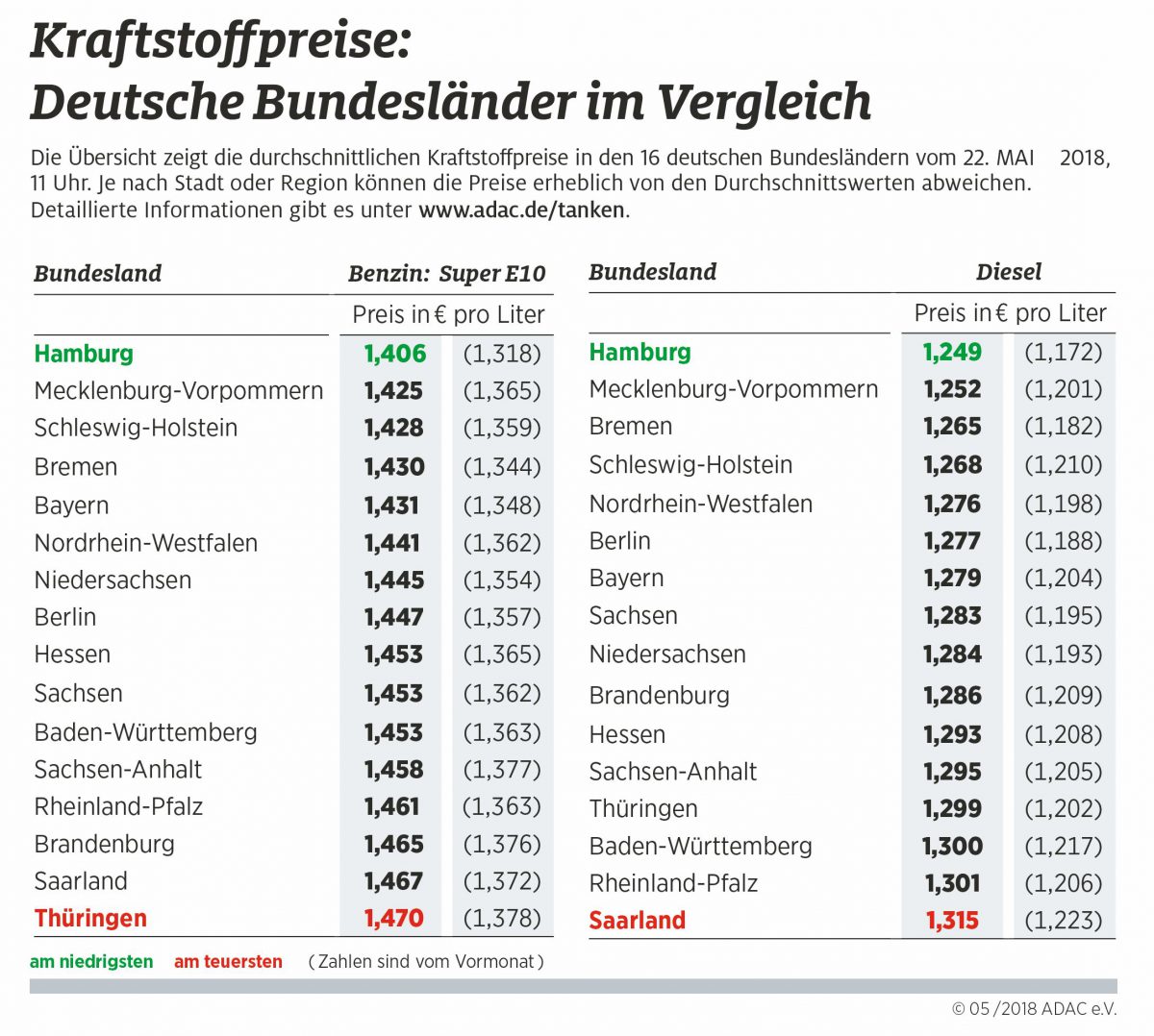 In der aktuellen Untersuchung hat der ADAC am heutigen Dienstag um 11 Uhr die Preisdaten von über 14.000 bei der Markttransparenzstelle erfassten Tankstellen ausgewertet und den Bundesländern zugeordnet. Die ermittelten Preise stellen eine Momentaufnahme dar. Der ADAC empfiehlt Autofahrern, sich vor dem Tanken über die aktuellen Kraftstoffpreise in der Nähe zu informieren. Einen schnellen Überblick erhält man über die App „ADAC Spritpreise“ sowie über www.adac.de/tanken.