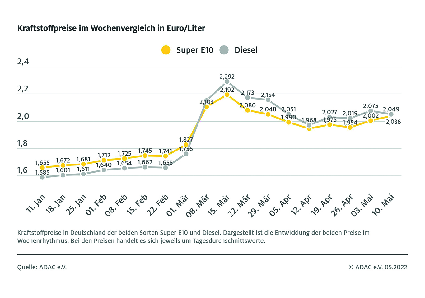 Laut ADAC sind die Spritpreise weiter stark überteuert. So waren die Rahmenbedingungen für die Bildung der Kraftstoffpreise wie der Rohölpreis und der Dollarkurs Anfang März insgesamt vergleichbar mit den aktuellen. Damals lag der Preis für Super E10 jedoch bei 1,83 Euro und damit um 20 Cent niedriger als zurzeit. Diesel kostete Anfang März 1,76 Euro und damit 29 Cent weniger als aktuell.