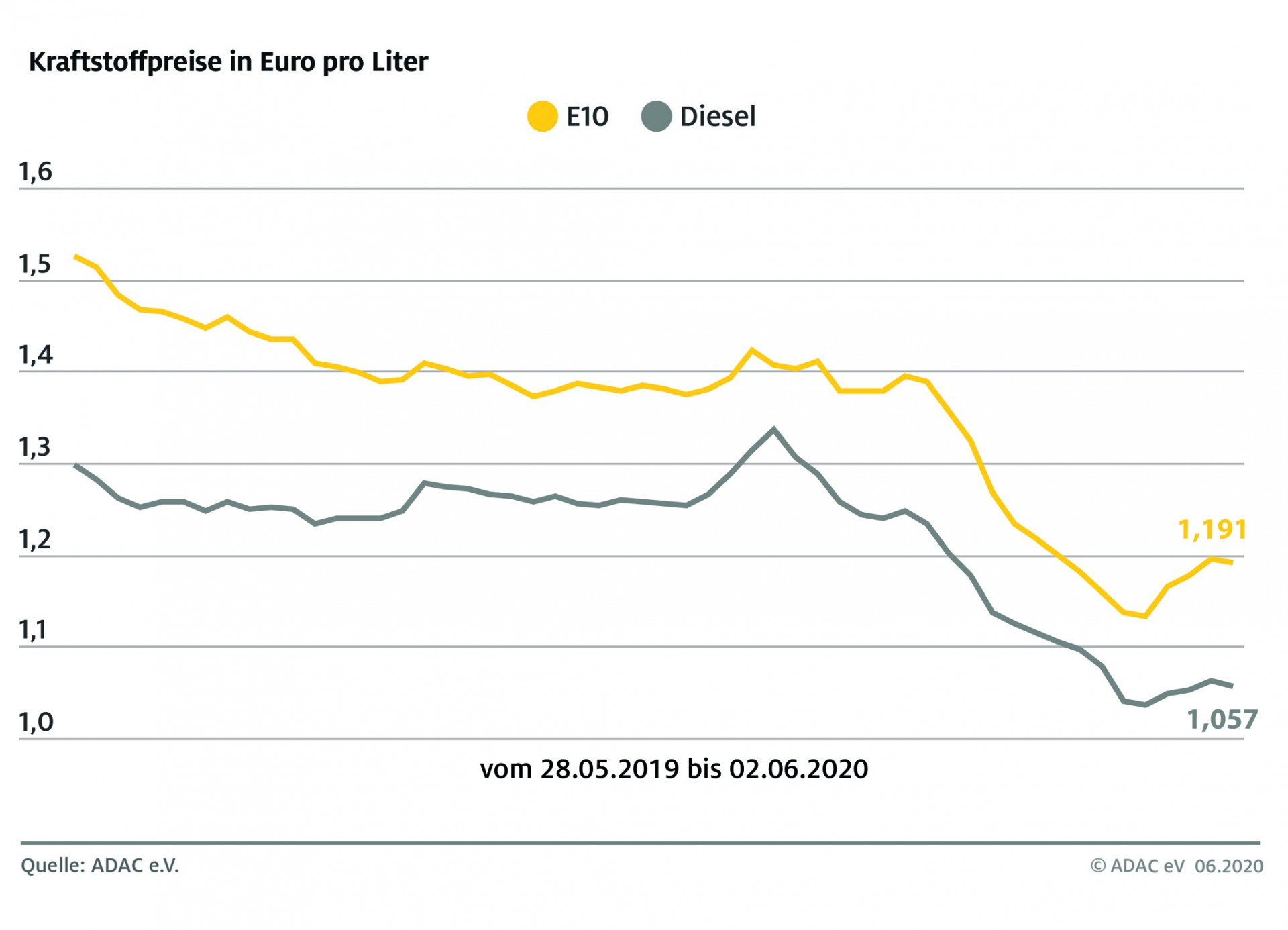 Die Kraftstoffpreise an den deutschen Tankstellen haben im Vergleich zur vergangenen Woche leicht nachgegeben. Wie die aktuelle Auswertung des ADAC zeigt, sank der Preis für einen Liter Super E10 gegenüber der Vorwoche im bundesweiten Mittel um 0,5 Cent auf 1,191 Euro. Ähnlich der Preisrückgang bei Diesel: Ein Liter kostet derzeit im Schnitt 1,057 Euro, das ist ein Minus von 0,6 Cent. Damit ist der Anstieg an den Zapfsäulen, den der ADAC in den vergangenen vier Wochen registriert hatte, fürs Erste gestoppt.