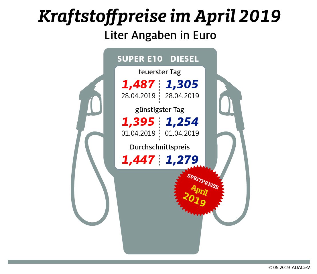 Am teuersten waren Super E10 und Diesel mit durchschnittlich 1,487 Euro beziehungsweise 1,305 Euro pro Liter am 28. April. Am wenigsten mussten Autofahrer zum Monatsbeginn bezahlen: Am 1. April kostete ein Liter Super E10 1,395 Euro und ein Liter Diesel 1,254 Euro.