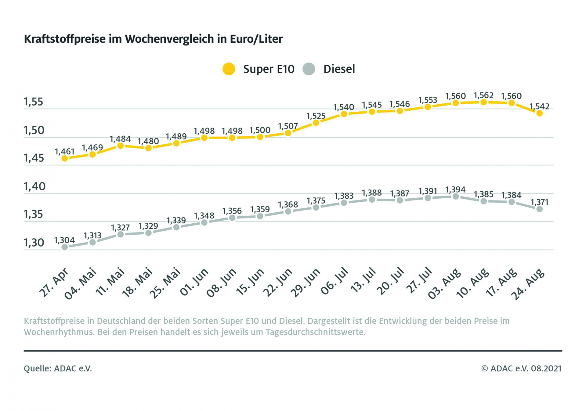Nach wochenlanger Stagnation auf sehr hohem Niveau hat der Rückgang der Kraftstoffpreise eingesetzt. Wie der ADAC mitteilt, ist der Preis für einen Liter Super E10 binnen Wochenfrist im bundesweiten Mittel um 1,8 Cent auf 1,542 Euro gesunken. Der Preis für Diesel-Kraftstoff ging um 1,3 Cent zurück und liegt derzeit bei 1,371 Euro. Dies zeigt die wöchentliche Auswertung der Kraftstoffpreise in Deutschland.