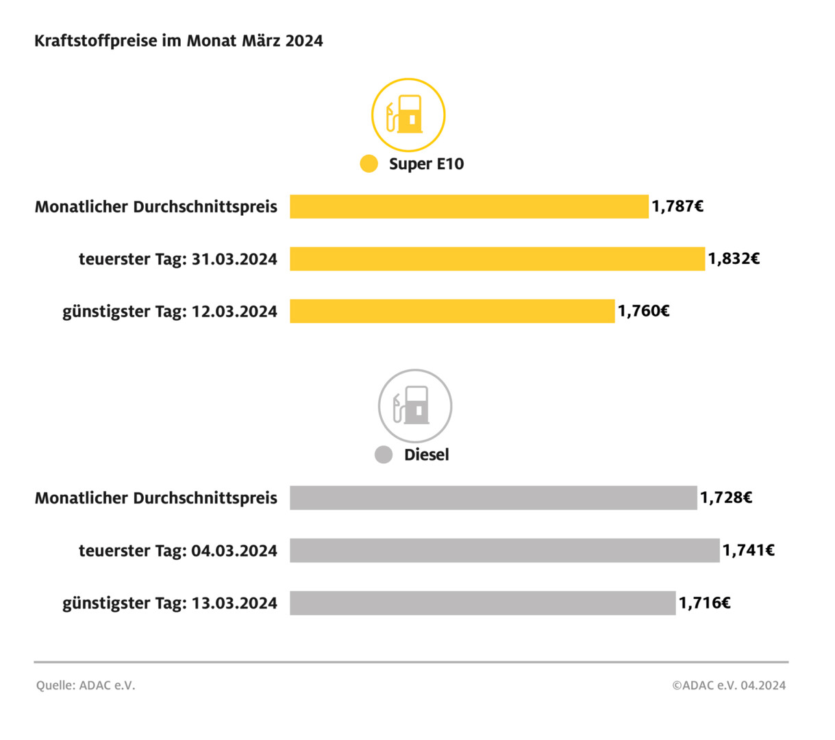 Am teuersten war Super E10 am 31. März 2024 mit 1,832 Euro. Der letzte Tag des Monats markierte gleichzeitig auch den bislang teuersten Tag des Jahres. Der günstigste Tag zum Tanken war für die Fahrer von Benzinern am 12. März mit 1,760 Euro je Liter Super E10. Bei Diesel war die Preisspanne innerhalb des Monats geringer: Am teuersten war Diesel am 4. März mit 1,741 Euro, am wenigsten musste man mit 1,716 Euro am 13. März bezahlen.