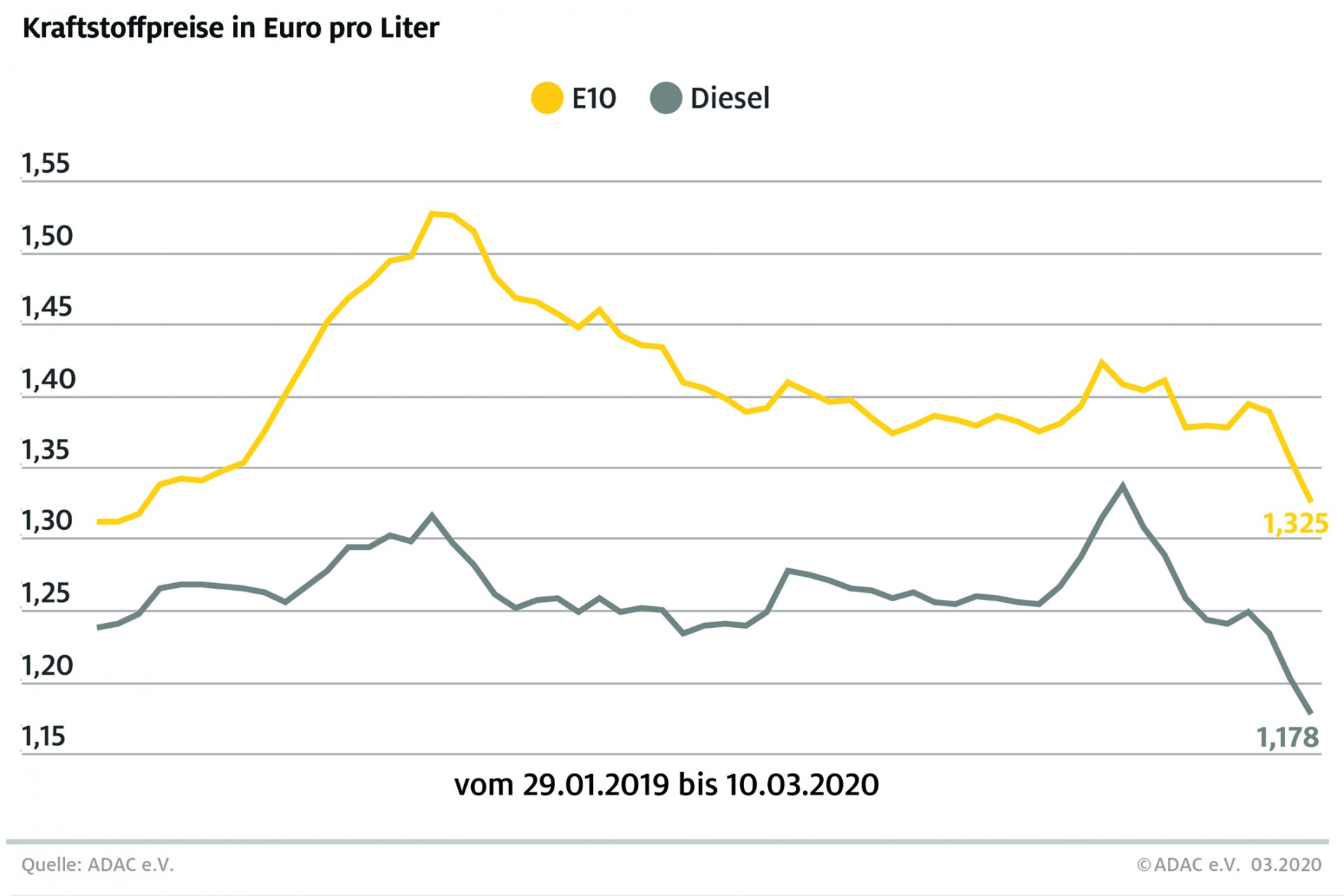 Die Spritpreise an den Tankstellen geben weiter nach. Dies ist vor allem eine Folge der eingebrochenen Rohölnotierungen. Laut aktueller Auswertung des ADAC kostet ein Liter Super E10 im Bundesmittel 1,325 Euro, das sind 3,1 Cent weniger als in der Vorwoche. Diesel verbilligte sich um 2,4 Cent auf durchschnittlich 1,178 Euro je Liter.