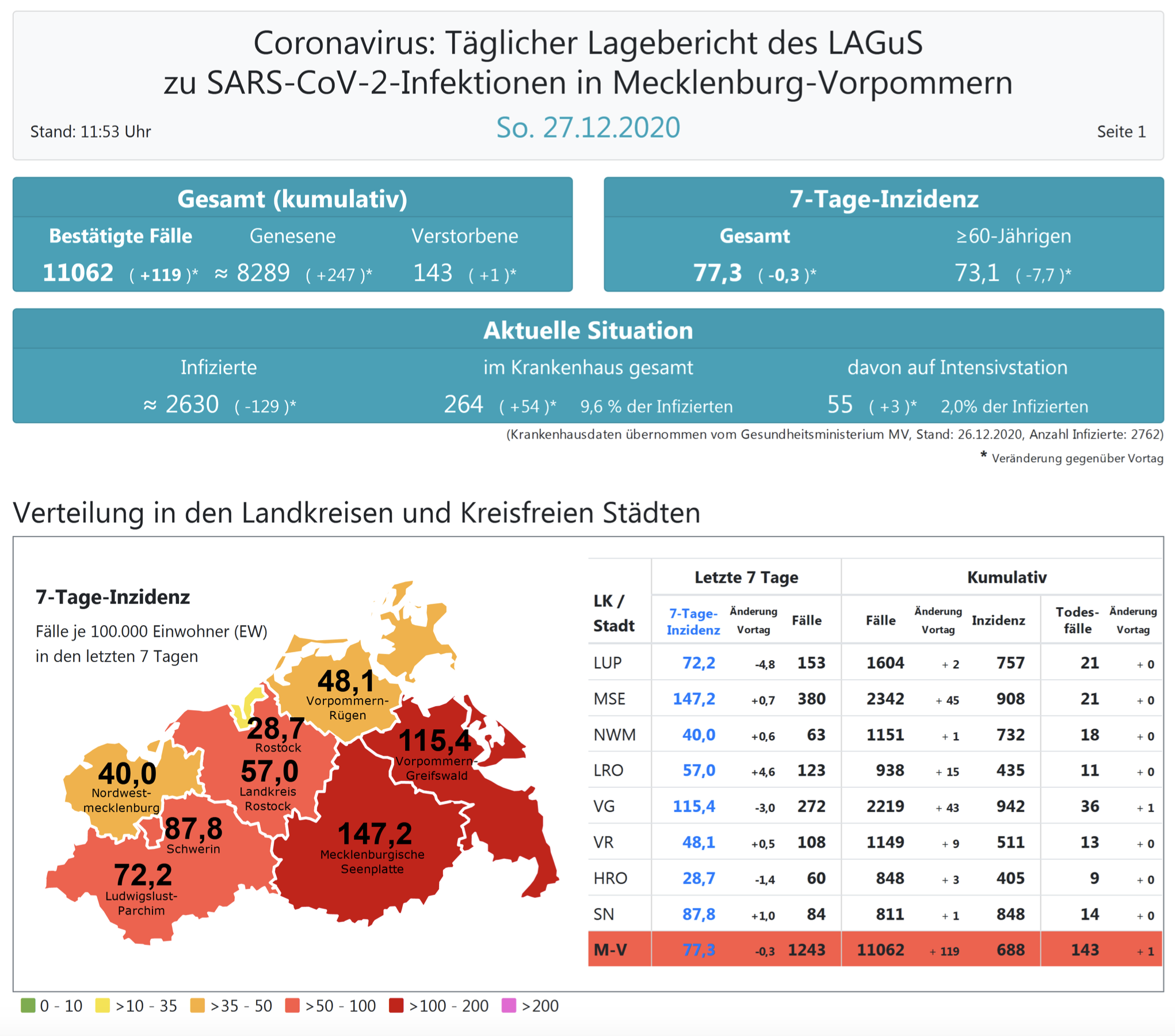 In Mecklenburg-Vorpommern sind bis zum Mittag 119 neue Corona-Infektionen registriert worden. Der Landkreis Mecklenburgische Seenplatte meldet mit 45 die meisten Neuinfektionen. Der Inzidenzwert liegt in unserem Landkreis heute bei 147,2. Allerdings ist davon auszugehen, dass wegen der Feiertage weniger getestet wird und nicht alle Gesundheitsämter ihre Zahlen gemeldet haben.