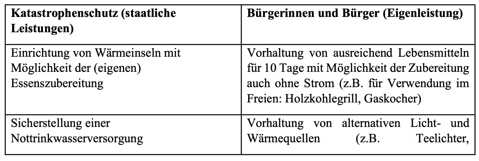 Übersicht über die staatlichen Leistungen sowie die Eigenleistungen der Bevölkerung im Krisenfall: