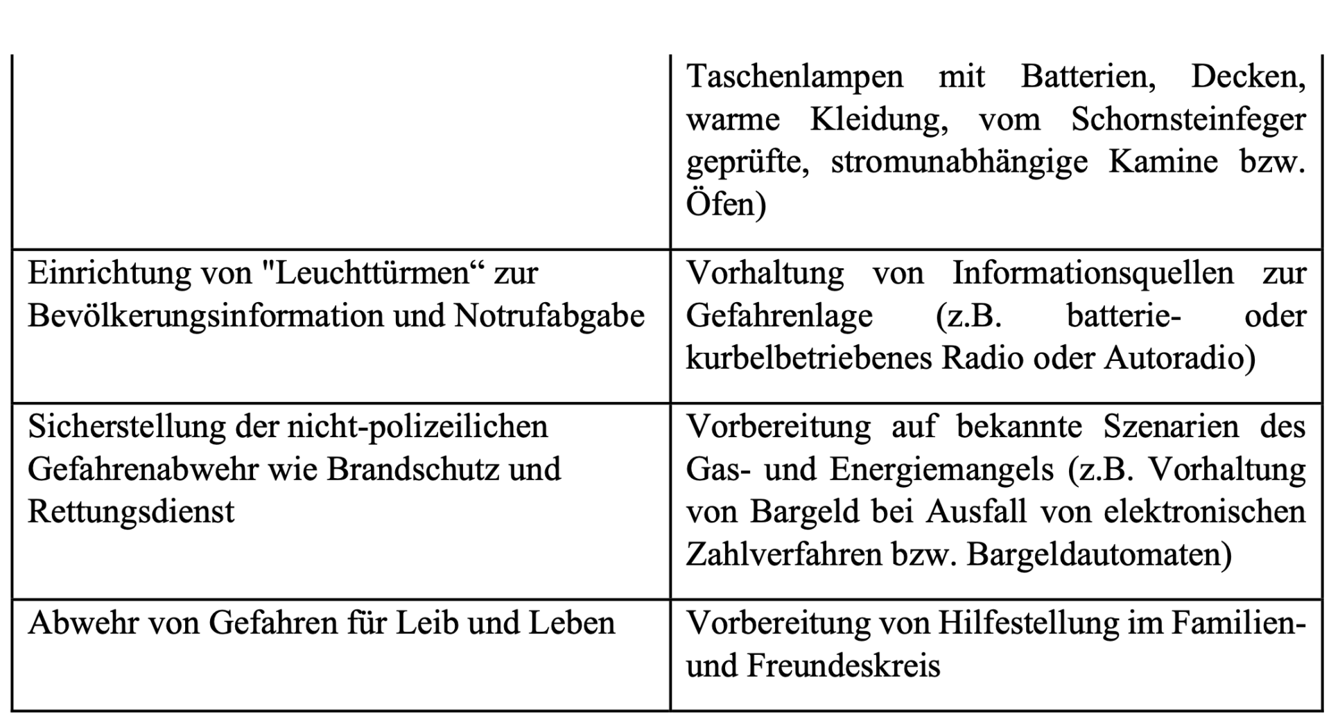 Daneben werden die Behörden sich um die Sicherstellung der nicht-polizeilichen Gefahrenabwehr (Brandschutz, Rettungsdienst) sowie um die möglichst weitgehende Aufrechterhaltung der kritischen Infrastruktur, wie die Wasserversorgung, kümmern. Generell steht dabei die Abwehr von Gefahren für Leib und Leben im Vordergrund. Durch die Einrichtung von „Wärmeinseln“ soll auf einen möglichen Ausfall von Heizungen reagiert werden. Die Wärmeinseln sind für den zeitweisen Aufenthalt gedacht und sollen nach Möglichkeit Sitzgelegenheiten sowie – je nach den Gegebenheiten vor Ort – Möglichkeiten zur Zubereitung eines heißen Getränks und ggf. zur Zubereitung einer warmen Mahlzeit vorsehen.