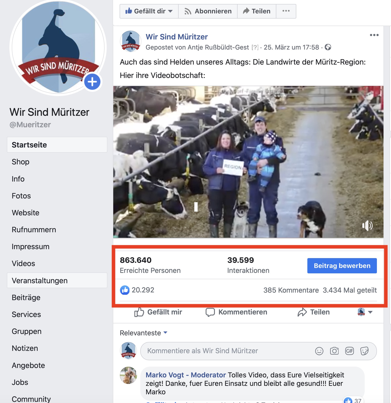 Am Mittwochabend haben wir die Videobotschaft der Müritzer Landwirte auf Facebook gepostet. Bis heute Abend hat dieser Post sagenhafte 20 292 Gefällt-mir-Klicks bekommen, wurde 3434mal geteilt und 385 mal kommentiert.