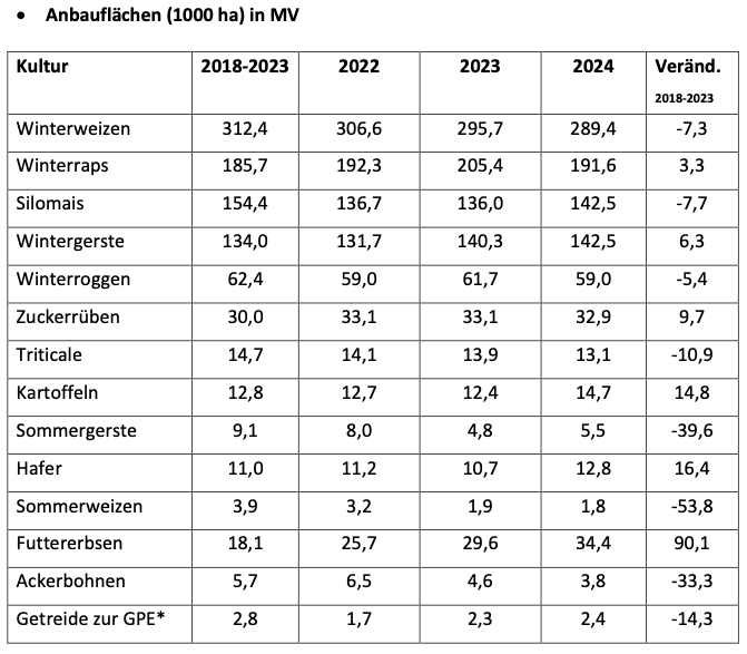 Insgesamt beweise das Jahr 2024 erneut, wie der Klimawandel mit extremen Regen- oder Hitzephasen die Landwirte zunehmend vor große Herausforderungen stellt. So hatten bereits die Regenfälle im vergangenen Herbst in Mecklenburg-Vorpommern für eine verspätete Aussaat bei vielen Kulturen gesorgt. Winter und zeitiges Frühjahr blieben nass. Die Bauern begannen deshalb später als normal mit der Aussaat der Sommerungen. Die hohen Niederschlagsmengen führten zum Teil zu Verschlämmungen und Verkrustungen an der Bodenoberfläche. Dadurch entwickelten sich die Pflanzen zunächst nur zögerlich.