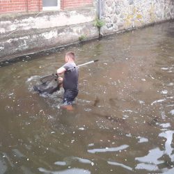 Letztlich schafften es die Angler, den dicken Brocken an Land zu ziehen – allerdings war dafür auch ein Einsatz im Wasser nötig.