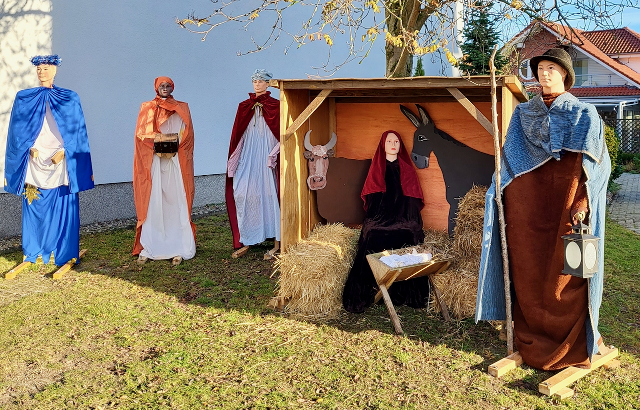 Mitglieder der Evangelisch-Freikirchlichen Gemeinde haben die Weihnachtsgeschichte dargestellt – für jedermann anzuschauen. „Wir haben in verschiedenen Szenen die Weihnachtsgeschichte aufgebaut. Es kann an einem Banner gelesen werden und man kann sich die Weihnachtsgeschichte auch anhören, wenn man den QR-Code am Banner scannt. Wir wollen allen Menschen die Möglichkeit geben, vom Weihnachtswunder zu erfahren“, so Grit Hoflehner von der Kirchgemeinde.