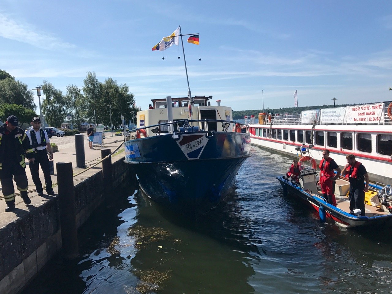Weil ein größeres Schiff, das an der Steinmole liegt, ein Leck in der Leitung hatte, mussten heute Vormittag Warens Feuerwehrleute ausrücken. Zum Glück ist nicht allzu viel Diesel ins Wasser gelangt. Die Kameraden hatten den Fall schnell im Griff.
